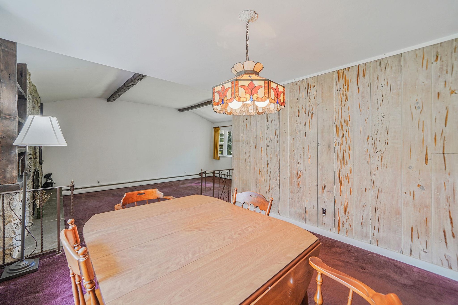 - Dining space with wooden walls, lofted ceiling, a baseboard radiator, and carpet flooring