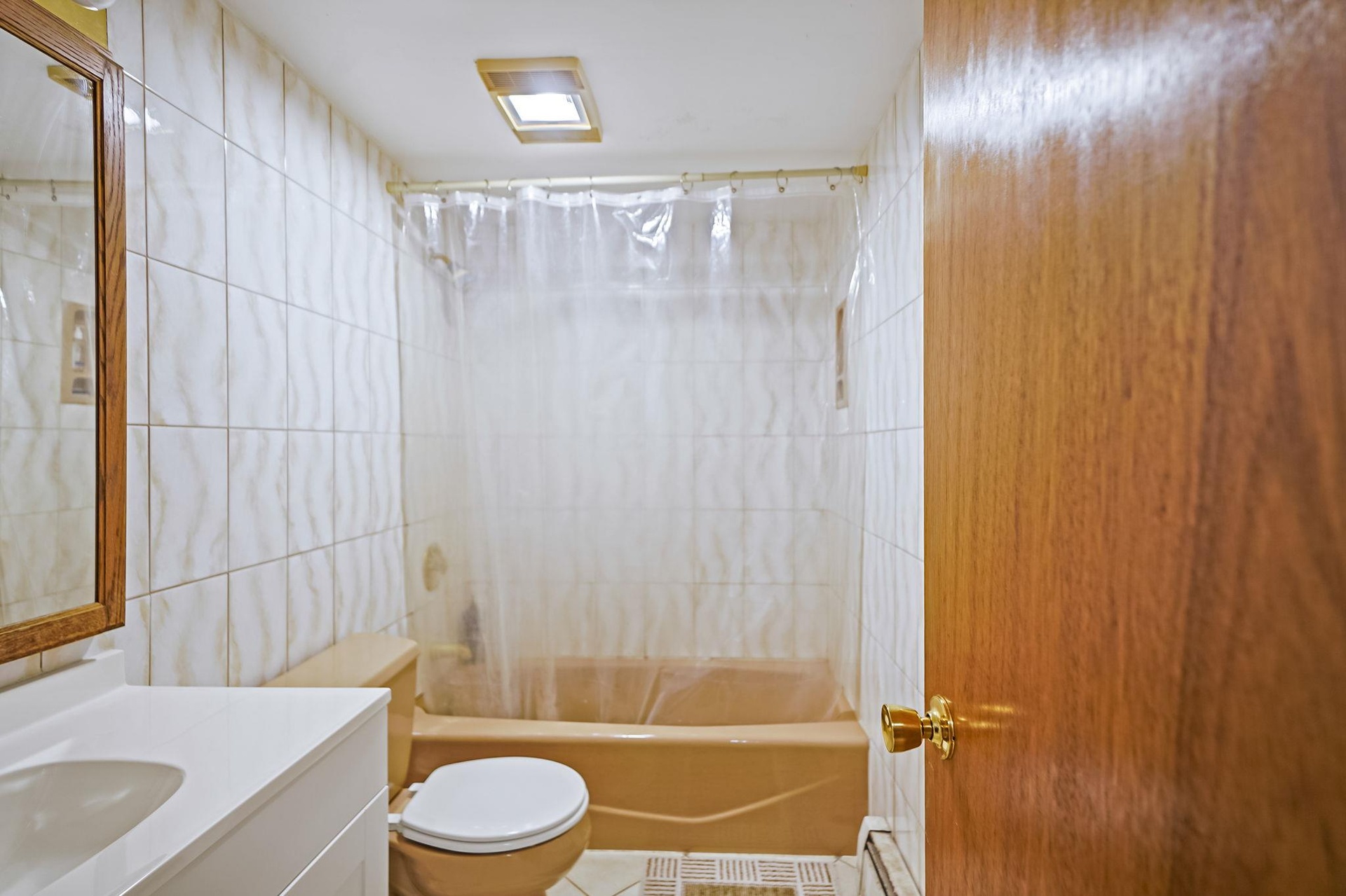 - Full bath featuring vanity, shower / bath combo with shower curtain, tile walls, and tile patterned flooring