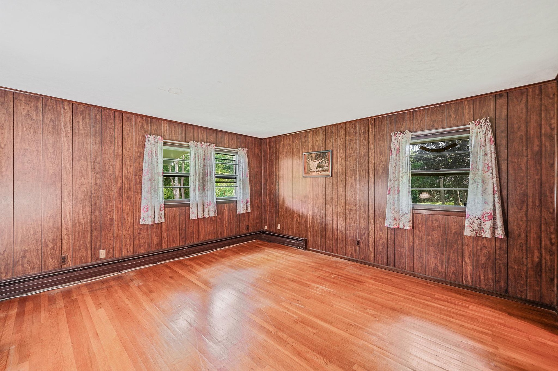 - Unfurnished room featuring wood finished floors, wood walls, and a baseboard heating unit