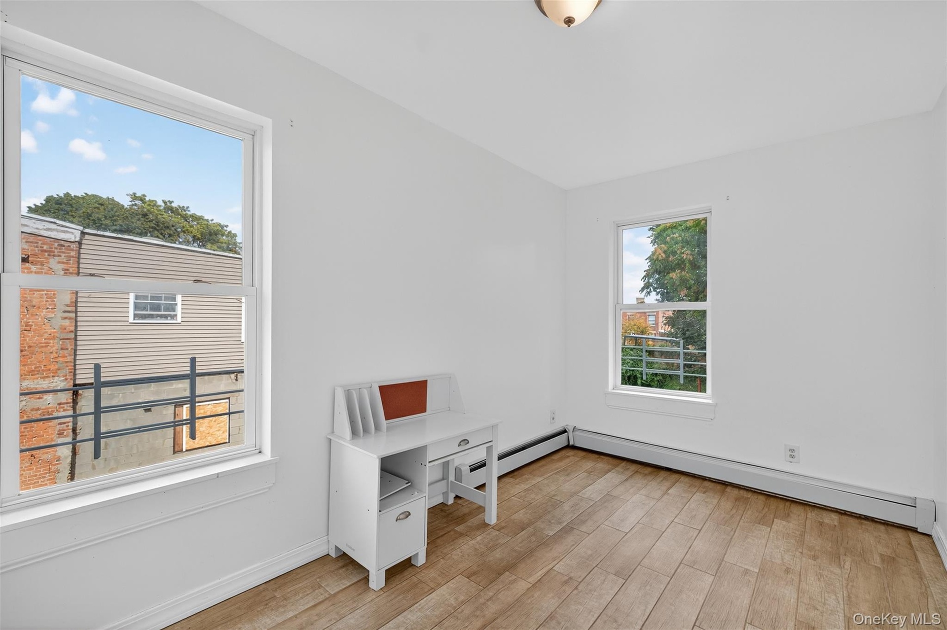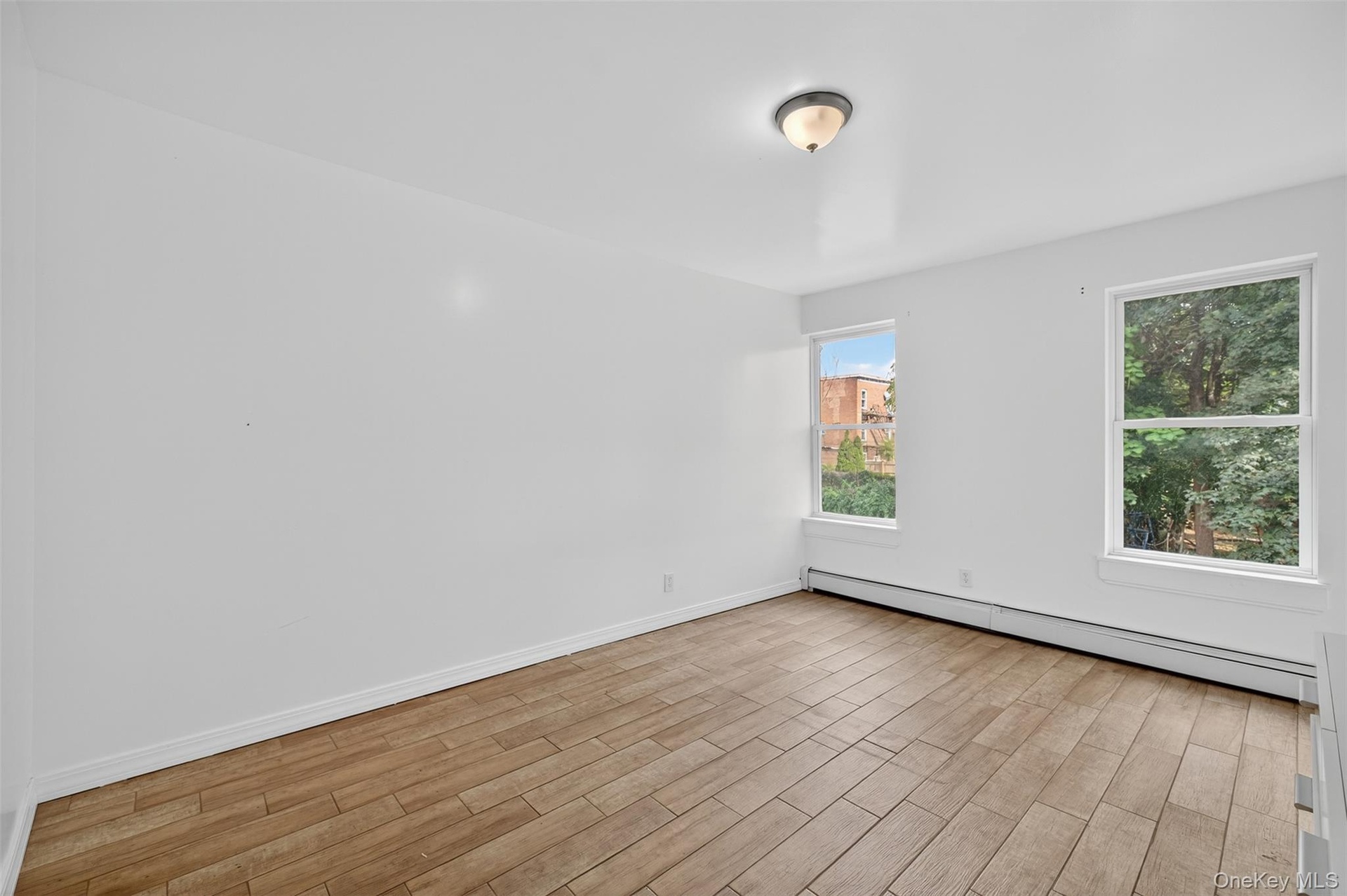 - Unfurnished bedroom with baseboard heating and light wood-style floors