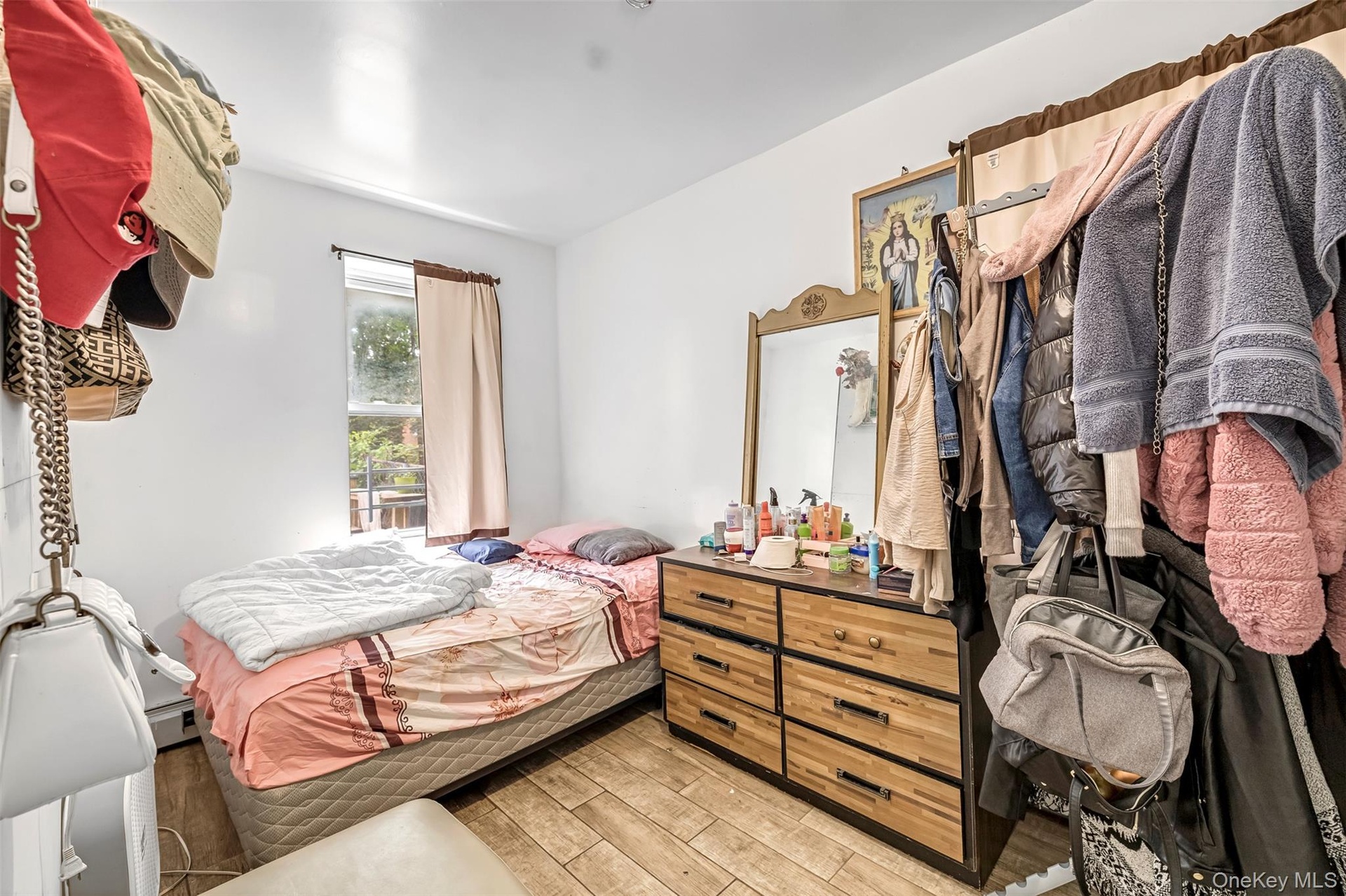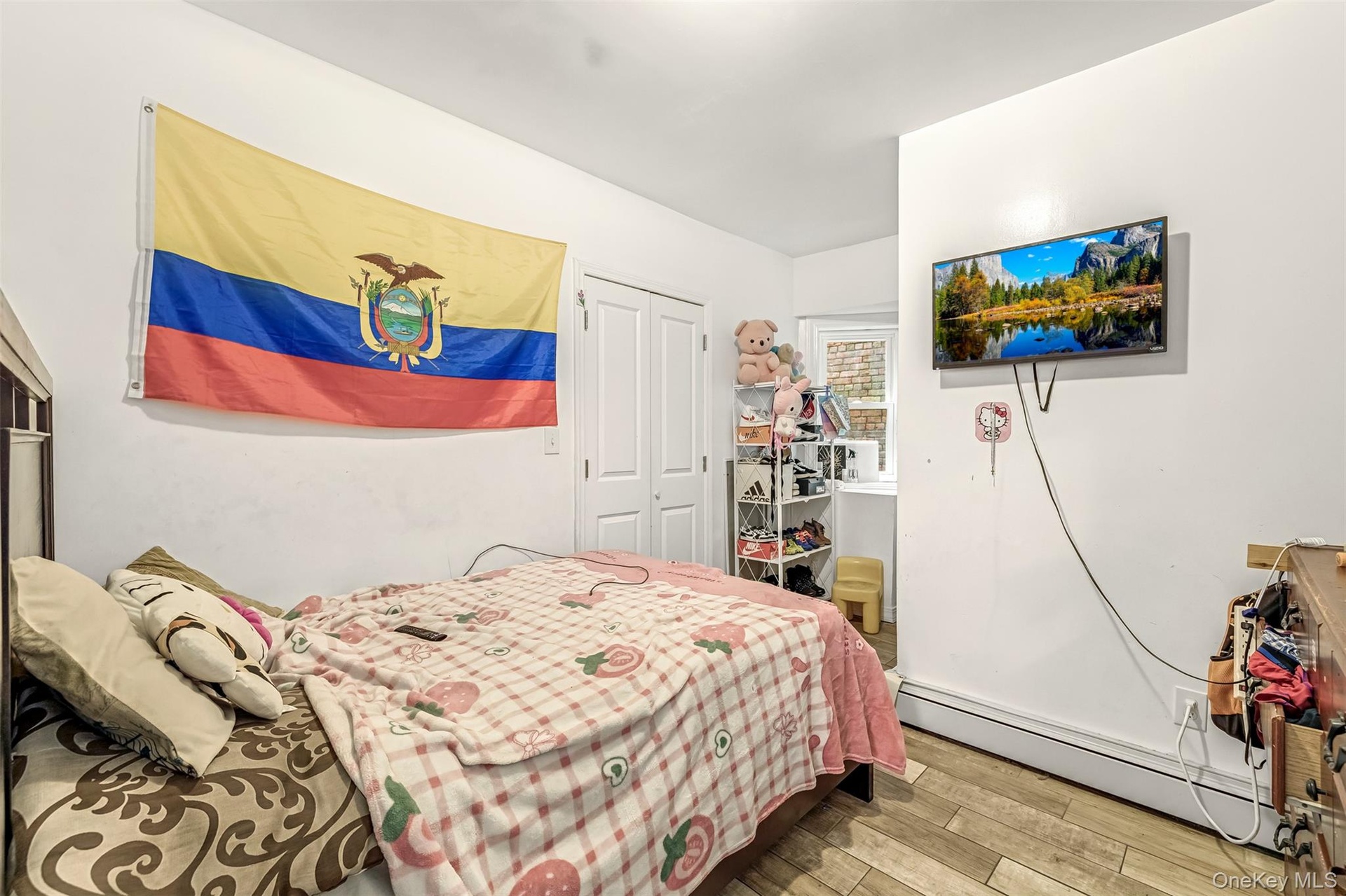 - Bedroom with a baseboard heating unit, wood finished floors, and a closet