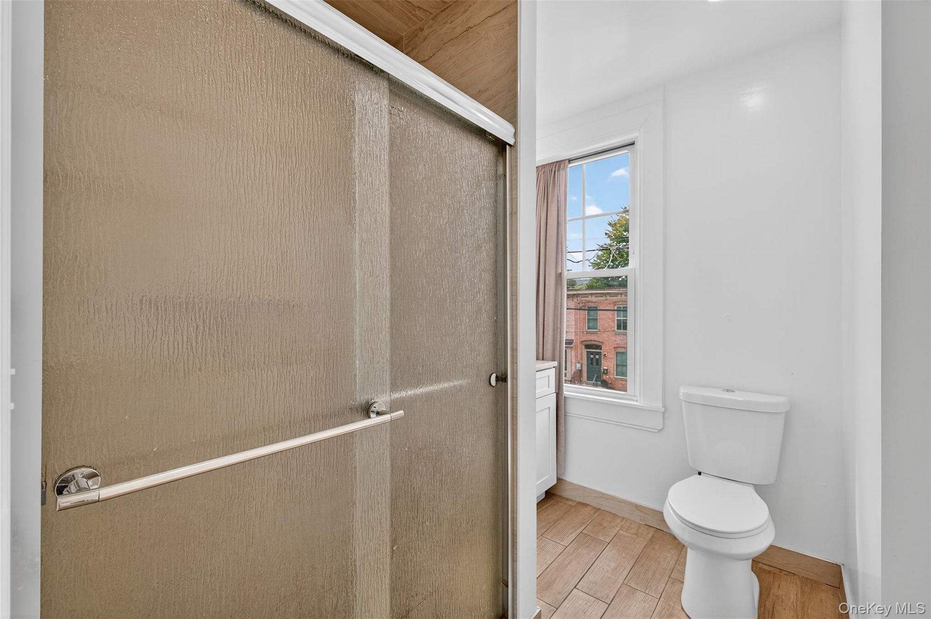 - Bathroom featuring a shower stall and wood finished floors