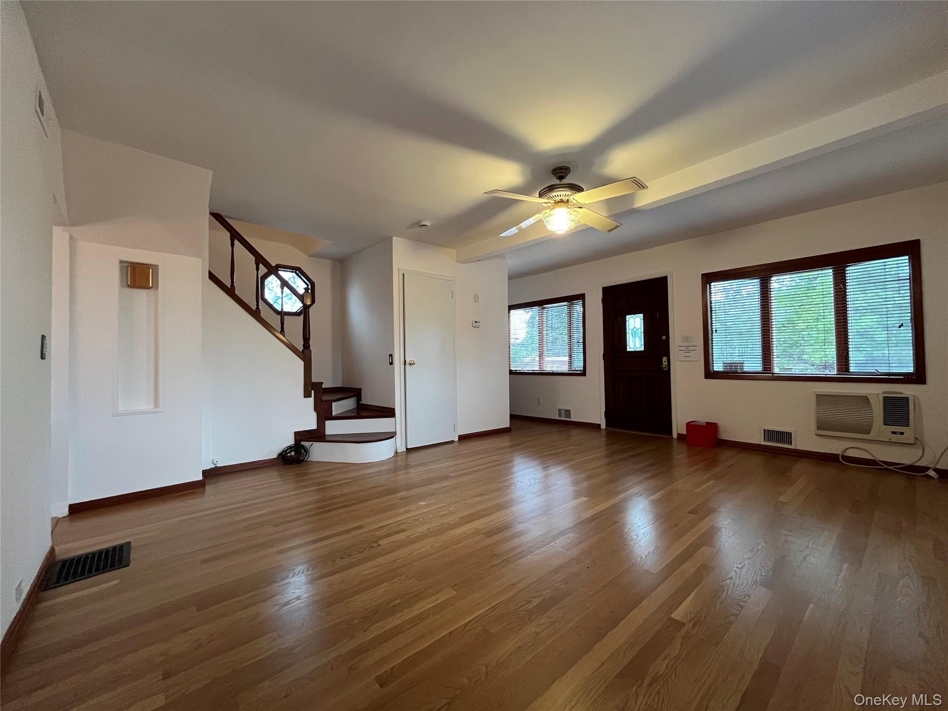 - Unfurnished living room with an AC wall unit, wood finished floors, ceiling fan, and stairway