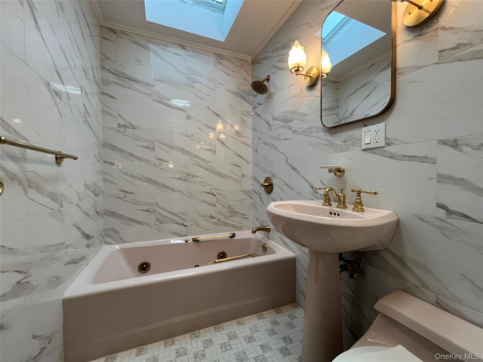 - Full bath featuring a skylight, tile walls, a combined bath / shower with jetted tub, and crown molding