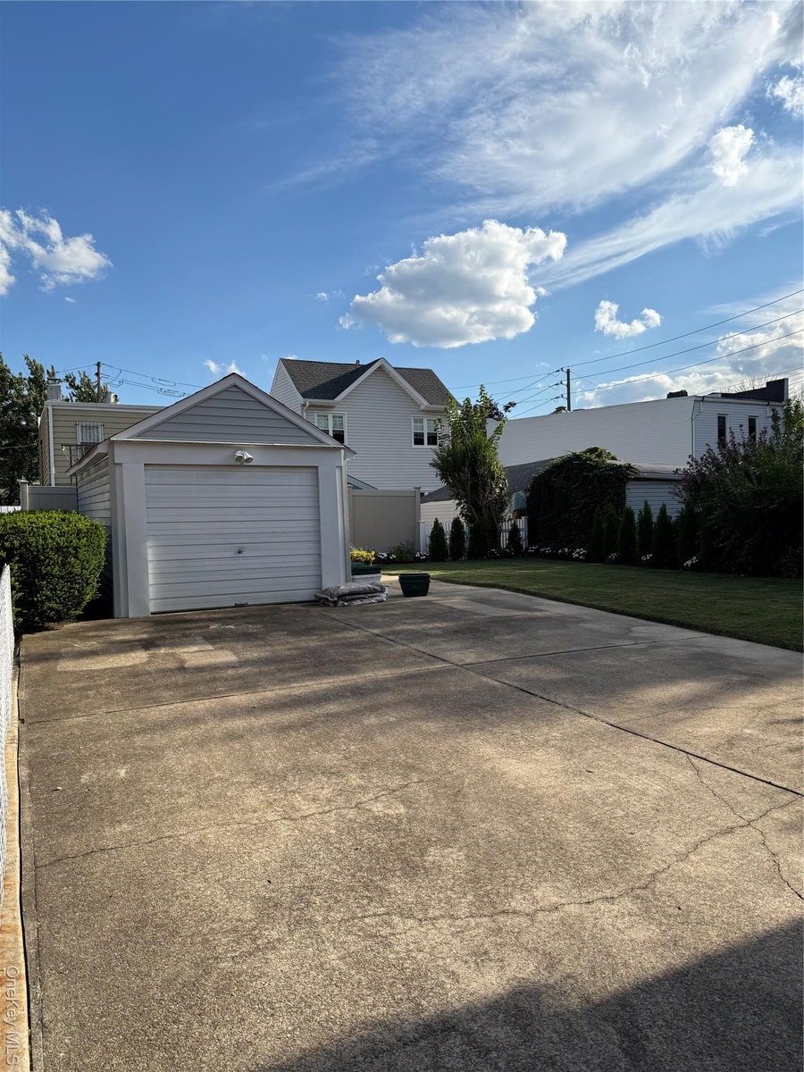 - View of front facade with an outdoor structure, driveway, and a detached garage