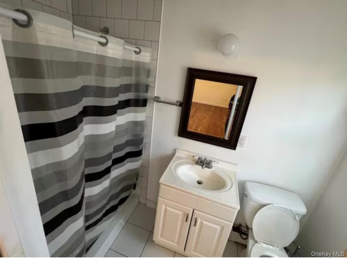 - Bathroom featuring vanity, a shower with shower curtain, and tile patterned floors