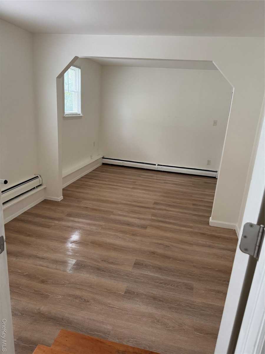 - Spare room with arched walkways, light wood-style flooring, and baseboard heating