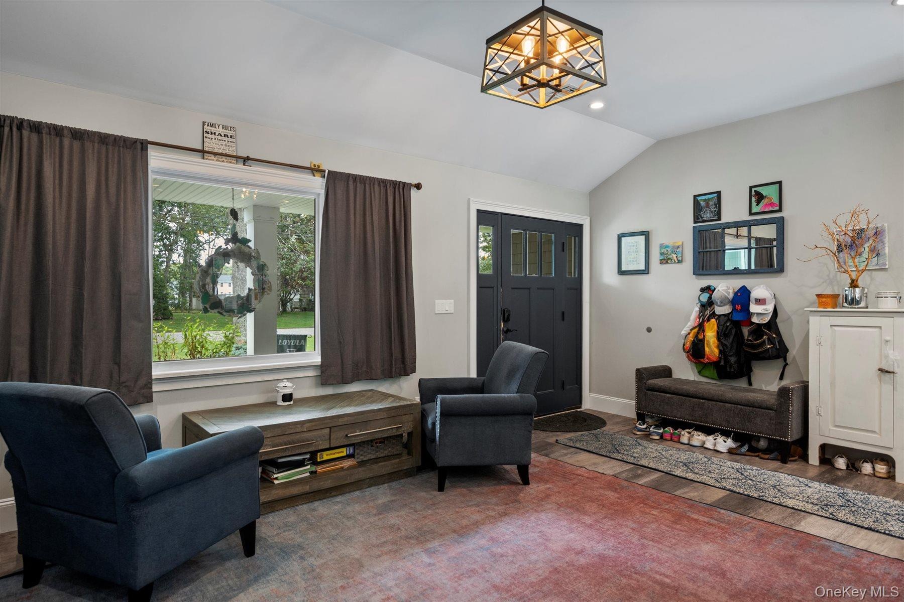 - Living area featuring vaulted ceiling, a chandelier, wood finished floors, and recessed lighting