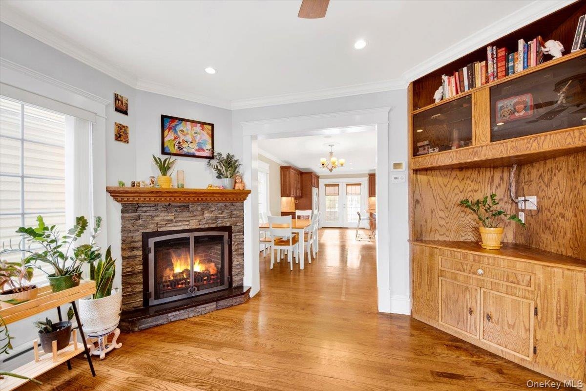 - Living area featuring light wood finished floors, a fireplace, a ceiling fan, recessed lighting, and ornamental molding