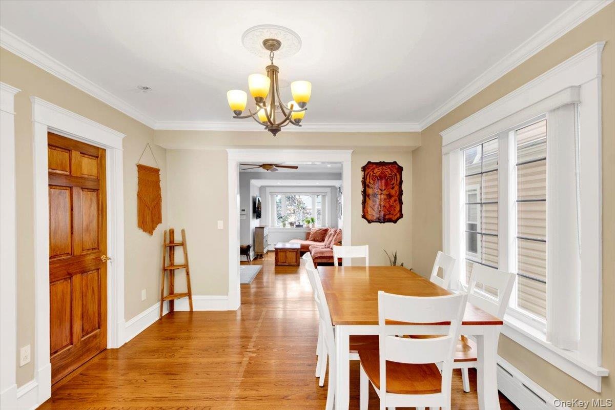 - Dining area with a chandelier, crown molding, light wood finished floors, a ceiling fan, and baseboard heating