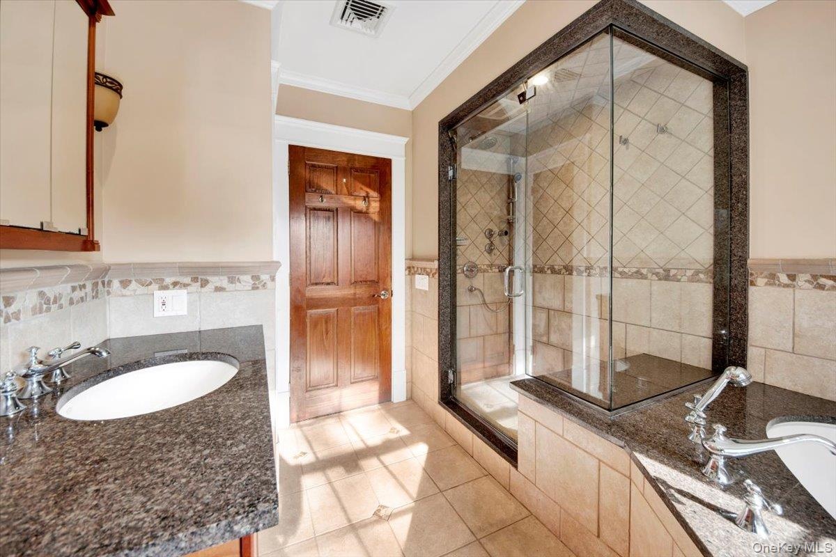 - Full bathroom with tile walls, a shower stall, tile patterned floors, ornamental molding, and a bath