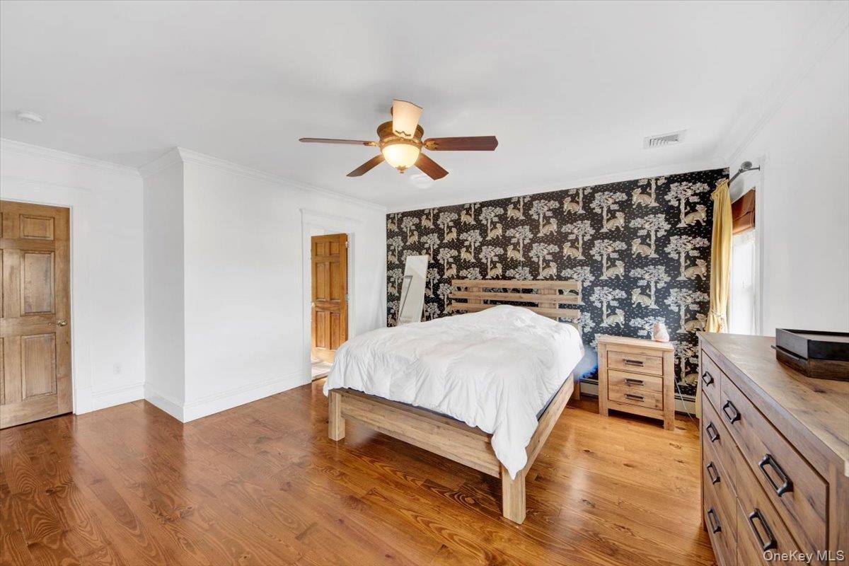 - Bedroom with wood finished floors, crown molding, and ceiling fan