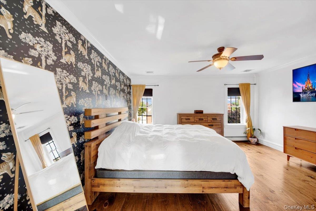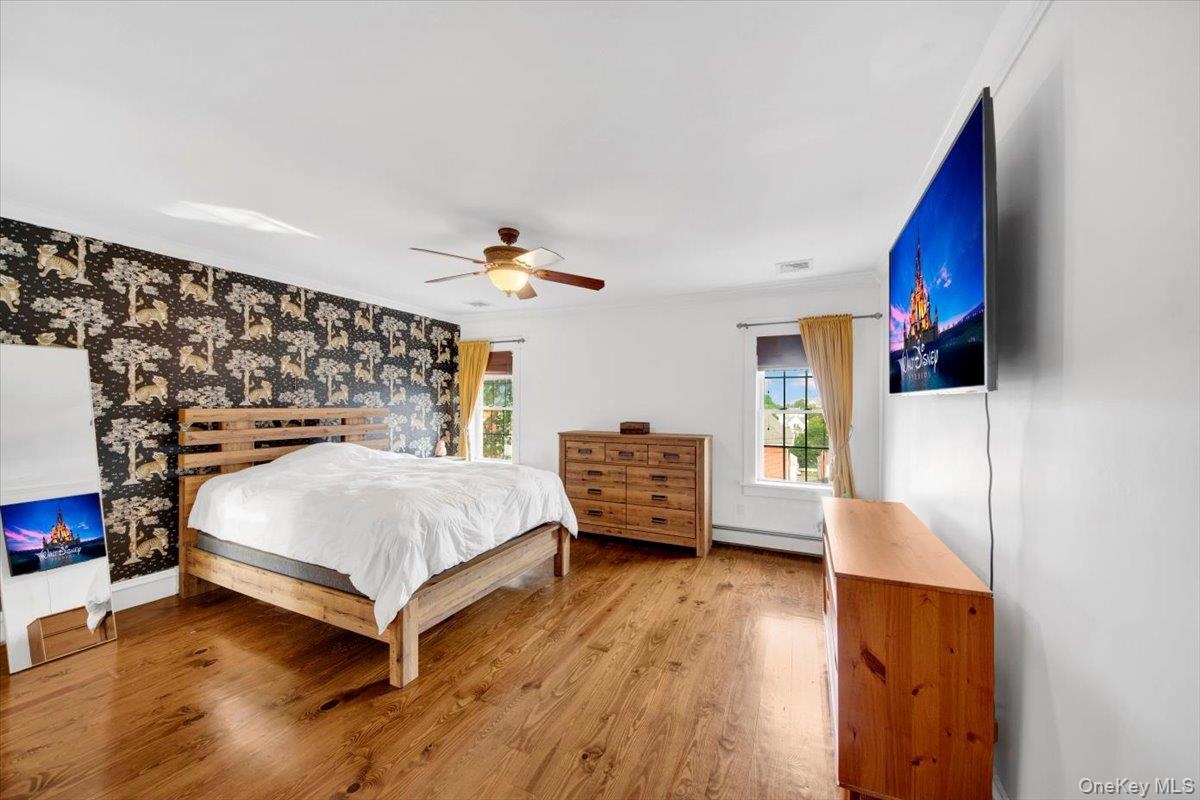 - Bedroom with multiple windows, wood finished floors, wallpapered walls, a baseboard radiator, and a ceiling fan