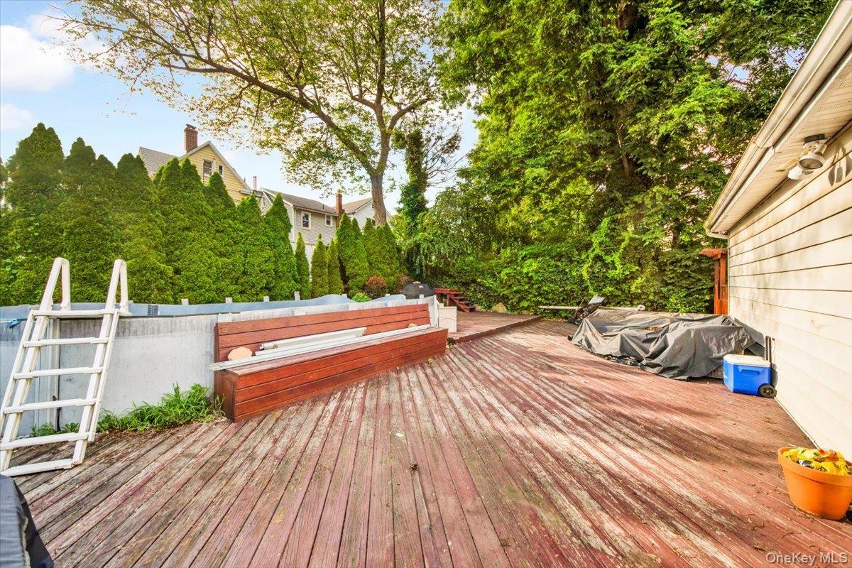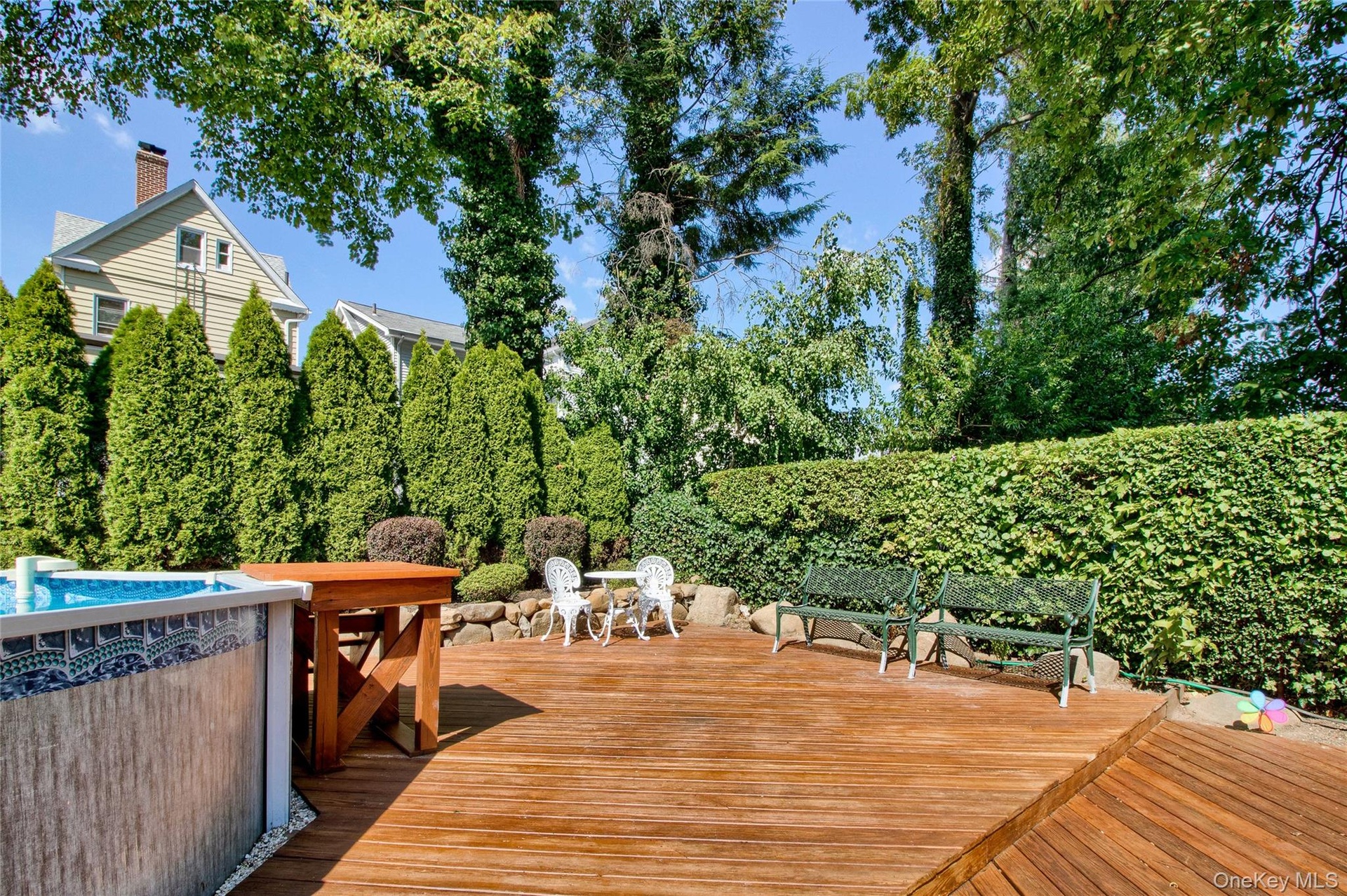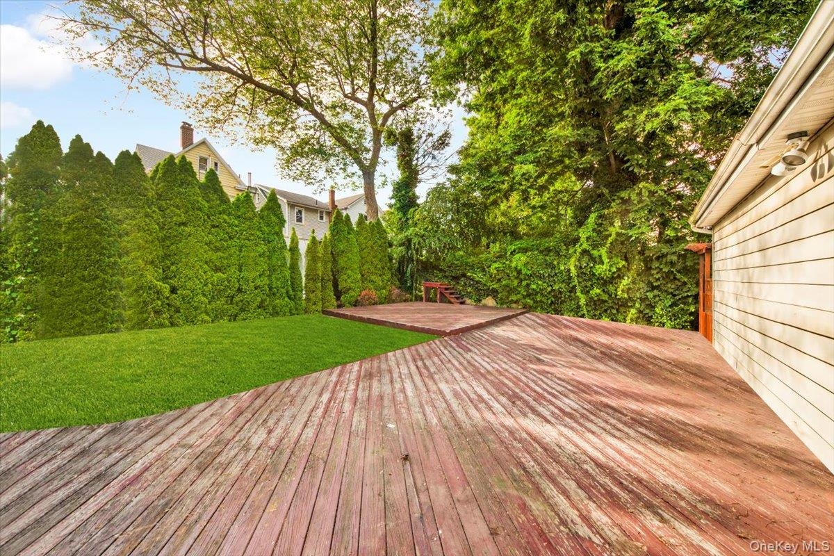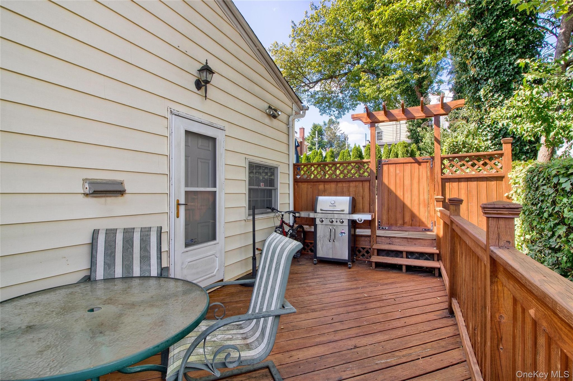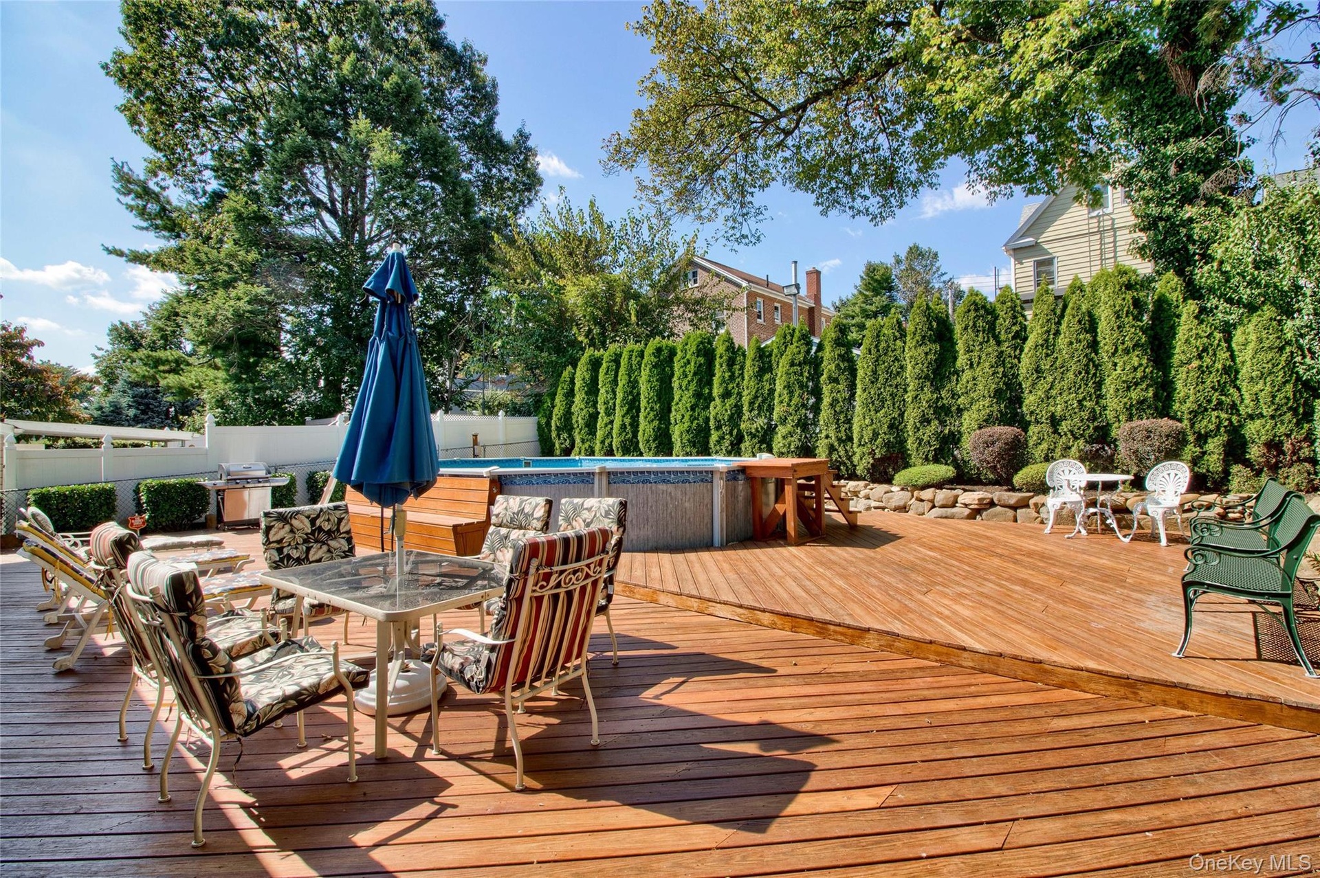 - Wooden terrace with outdoor dining area and a fenced backyard