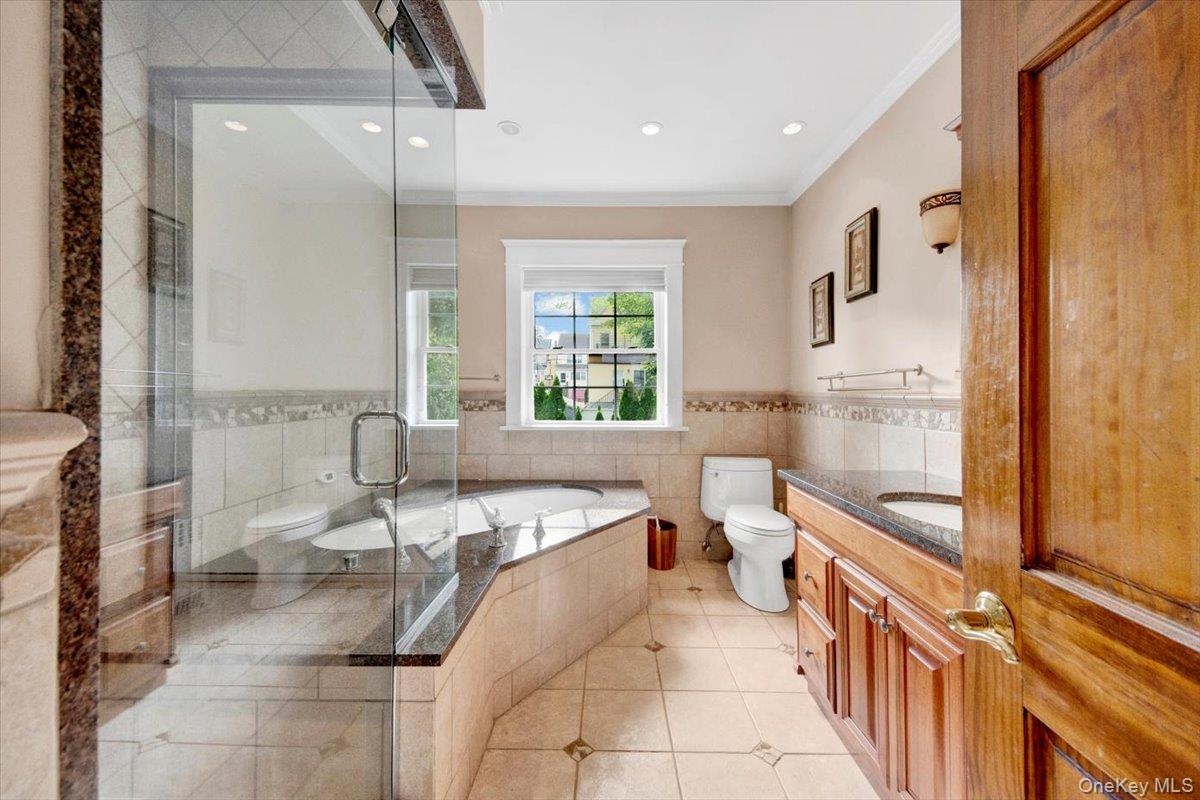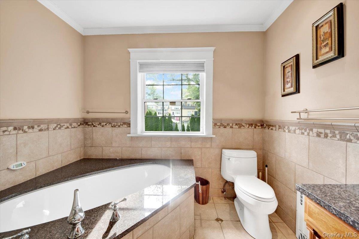 - Full bath with a garden tub, tile patterned flooring, crown molding, tile walls, and a wainscoted wall