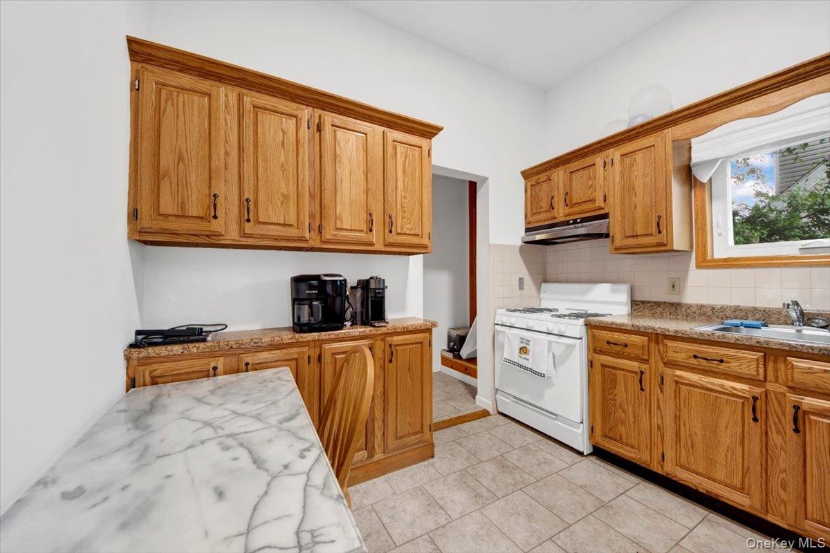 - Kitchen featuring gas range gas stove, decorative backsplash, under cabinet range hood, brown cabinets, and light stone countertops