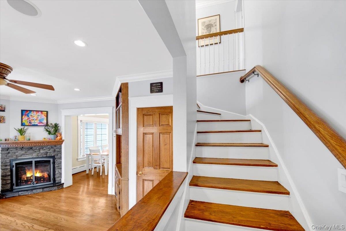 - Stairway featuring ceiling fan, ornamental molding, wood finished floors, a stone fireplace, and recessed lighting