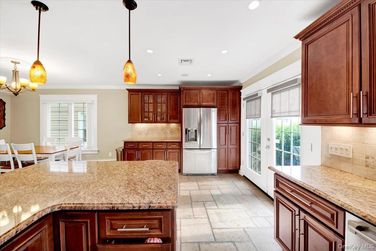 Step inside to experience the warmth of the new gas fireplace, accentuated by custom built-ins in the living room. The open floor plan seamlessly flows into the dining area, making entertaining a breeze. Culinary delights await in the newly renovated, large eat-in kitchen featuring lustrous granite countertops, top-of-the-line stainless steel appliances, chic new cabinetry, and the cozy luxury of underfloor heating.