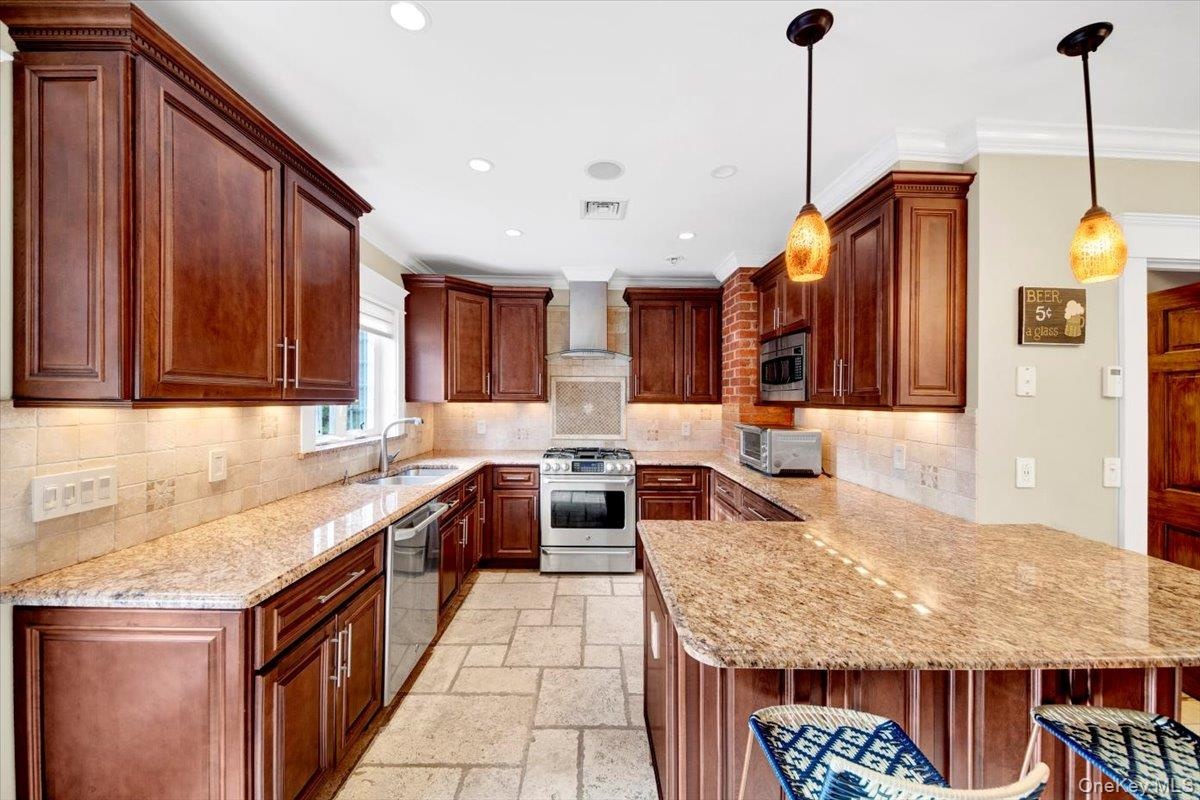 - Kitchen with stainless steel appliances, a peninsula, decorative backsplash, ornamental molding, and a chandelier