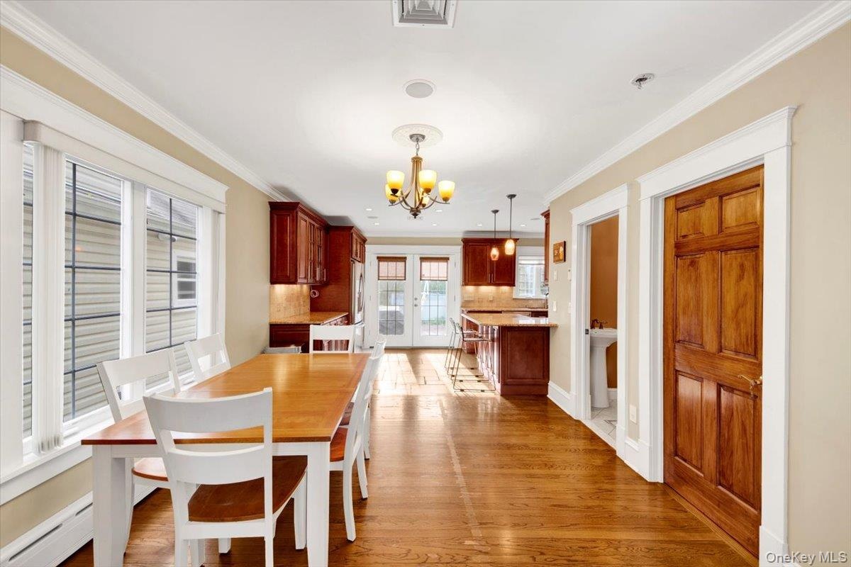 - Dining room featuring a chandelier, a baseboard radiator, light wood-type flooring, and ornamental molding