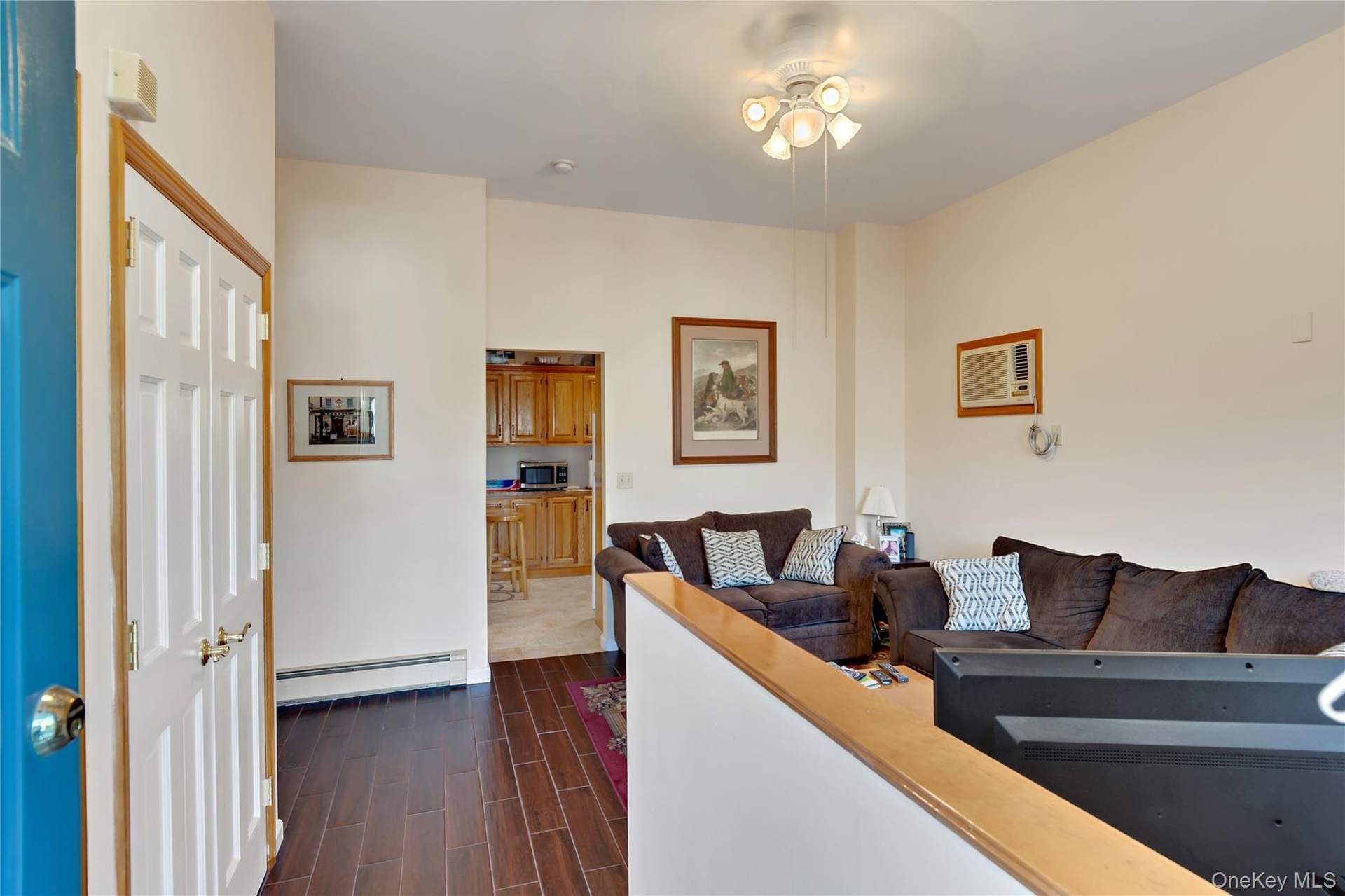 - Living area with wood finish floors, a baseboard heating unit, and a ceiling fan