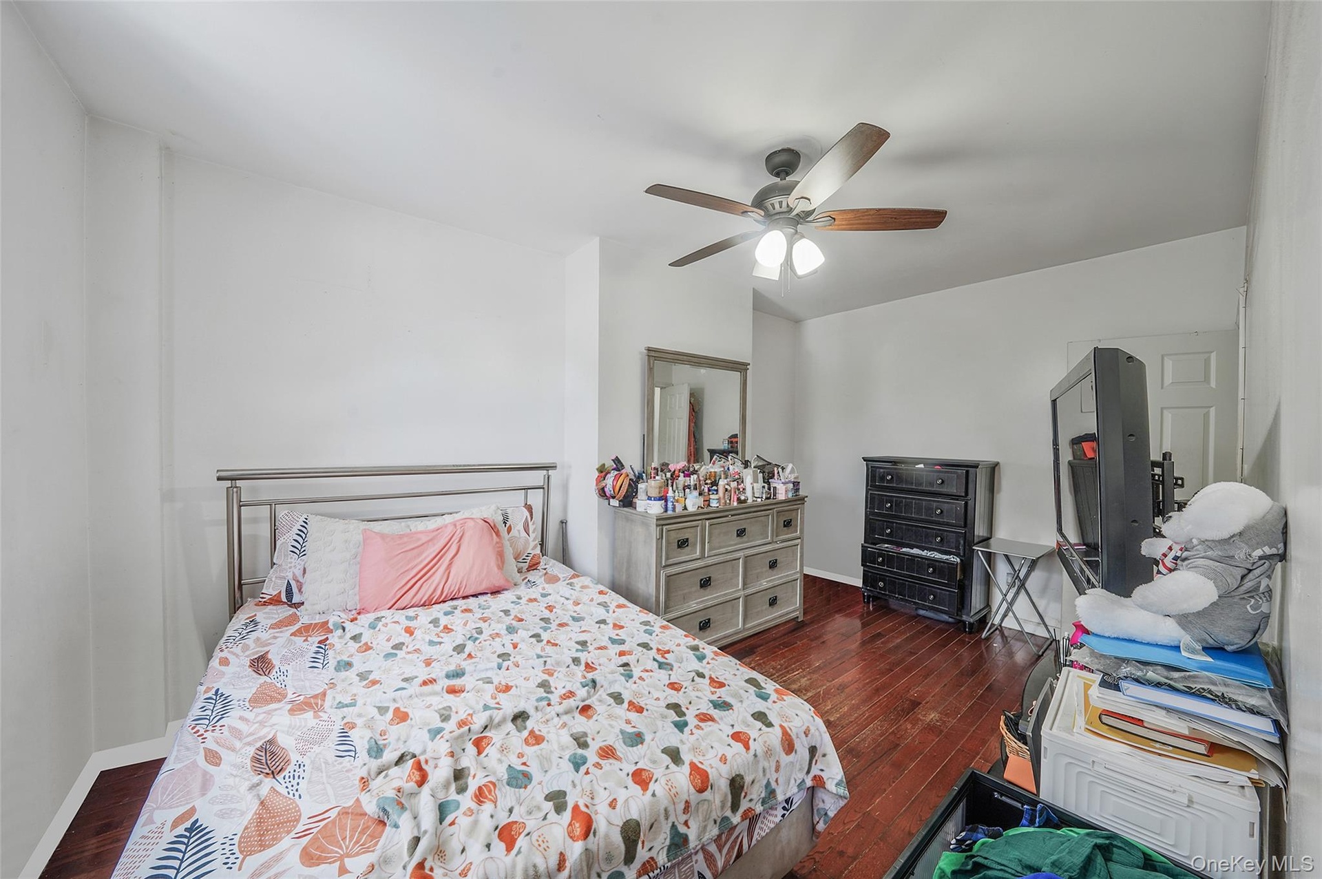 - Bedroom with hardwood / wood-style floors and a ceiling fan