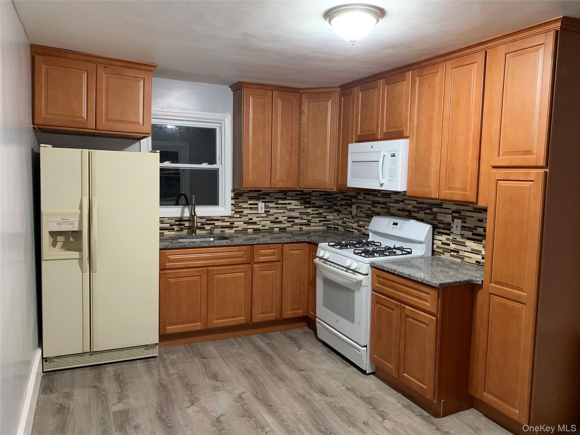 - Kitchen featuring white appliances, decorative backsplash, light wood-style floors, and brown cabinets