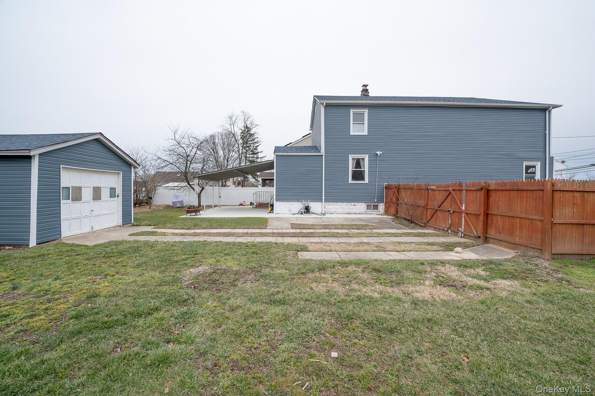 - Back of property with an outdoor structure, a patio, a detached garage, and a chimney