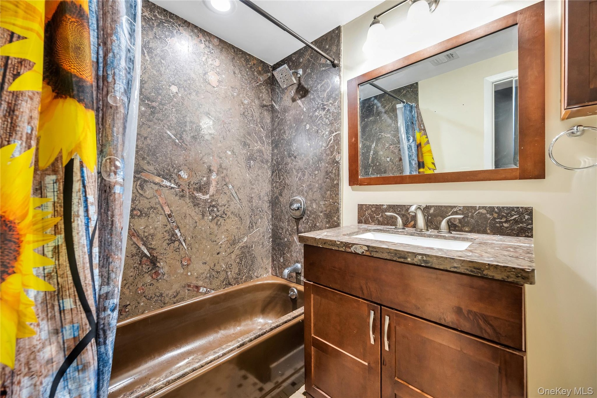 - Bathroom featuring a shower stall, vanity, tile walls, and backsplash