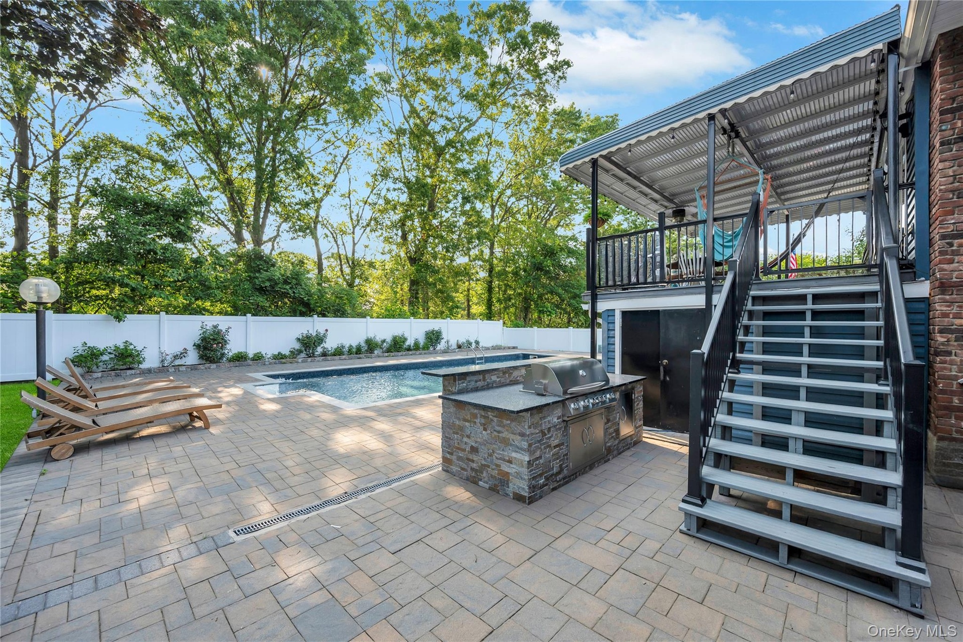 - View of swimming pool with stairway, a fenced backyard, a patio area, and area for grilling