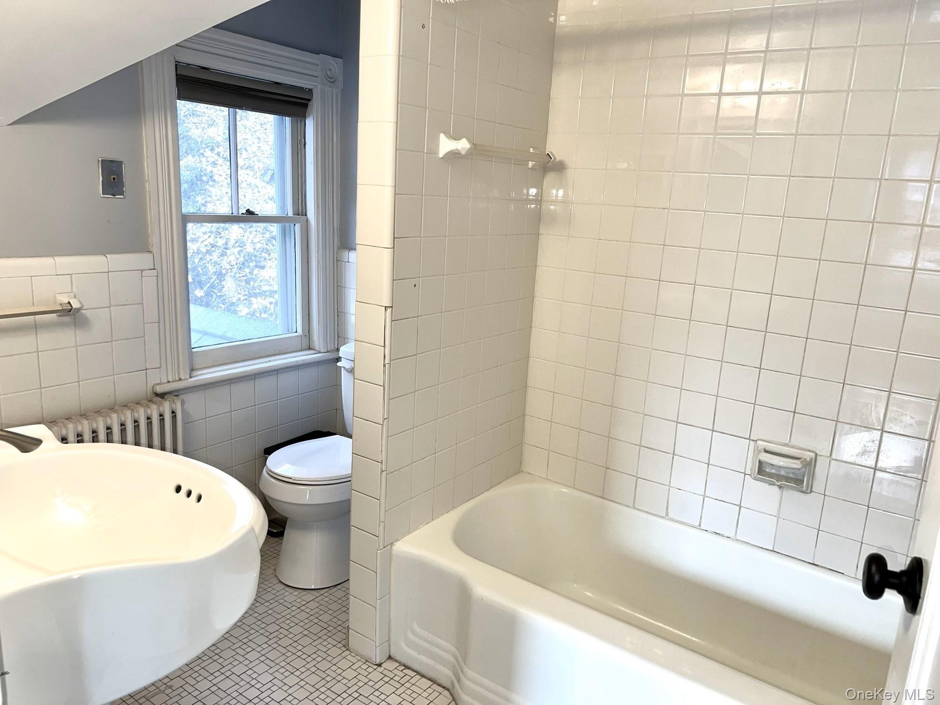 - Full bathroom featuring tiled shower / bath, tile walls, radiator heating unit, and tile patterned flooring