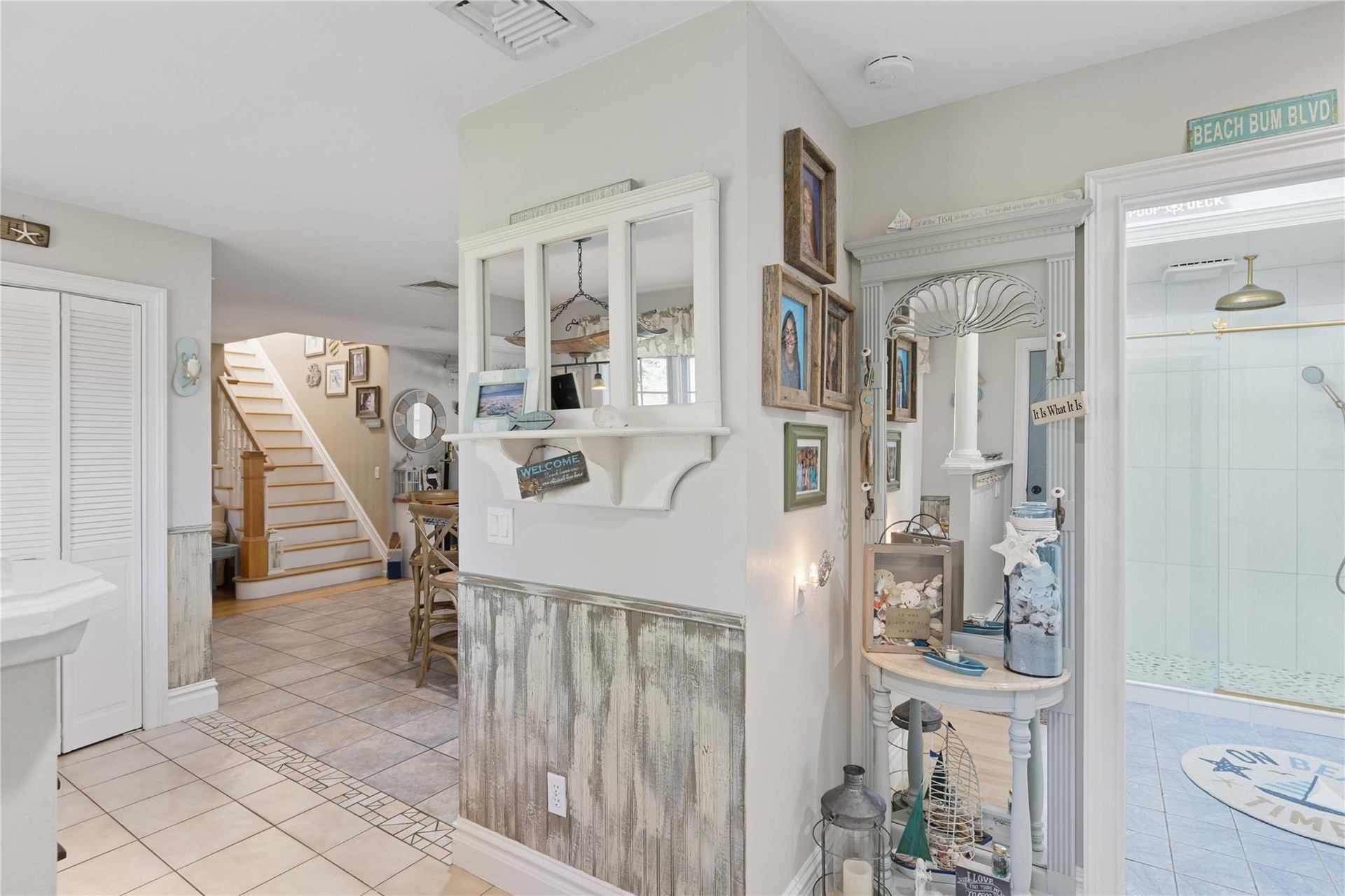 - Full bath featuring a shower stall, tile patterned floors, and vanity