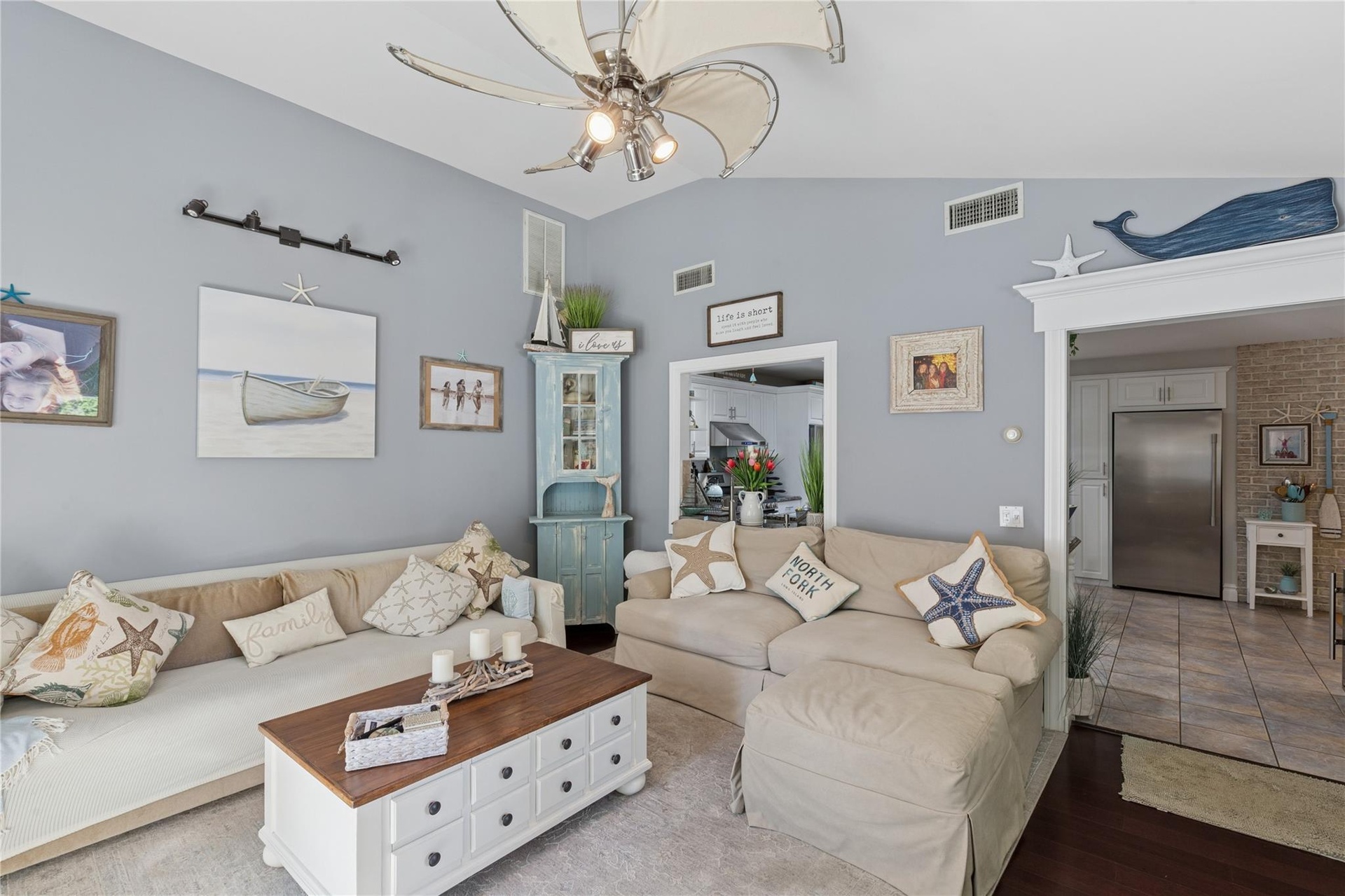 - Living area with a ceiling fan, high vaulted ceiling, and wood finished floors