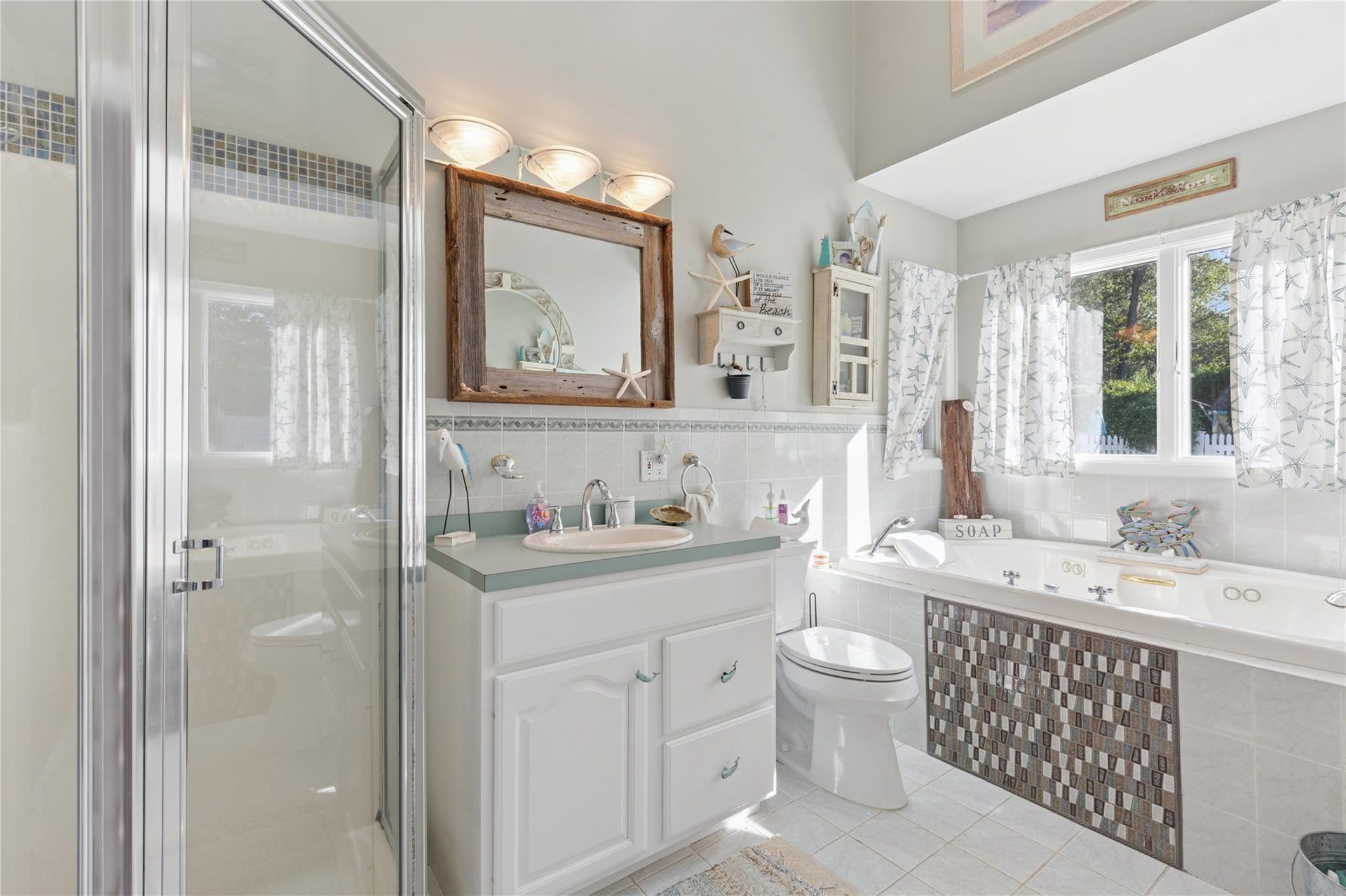 - Full bath featuring tile patterned flooring, a garden tub, vanity, a stall shower, and tile walls