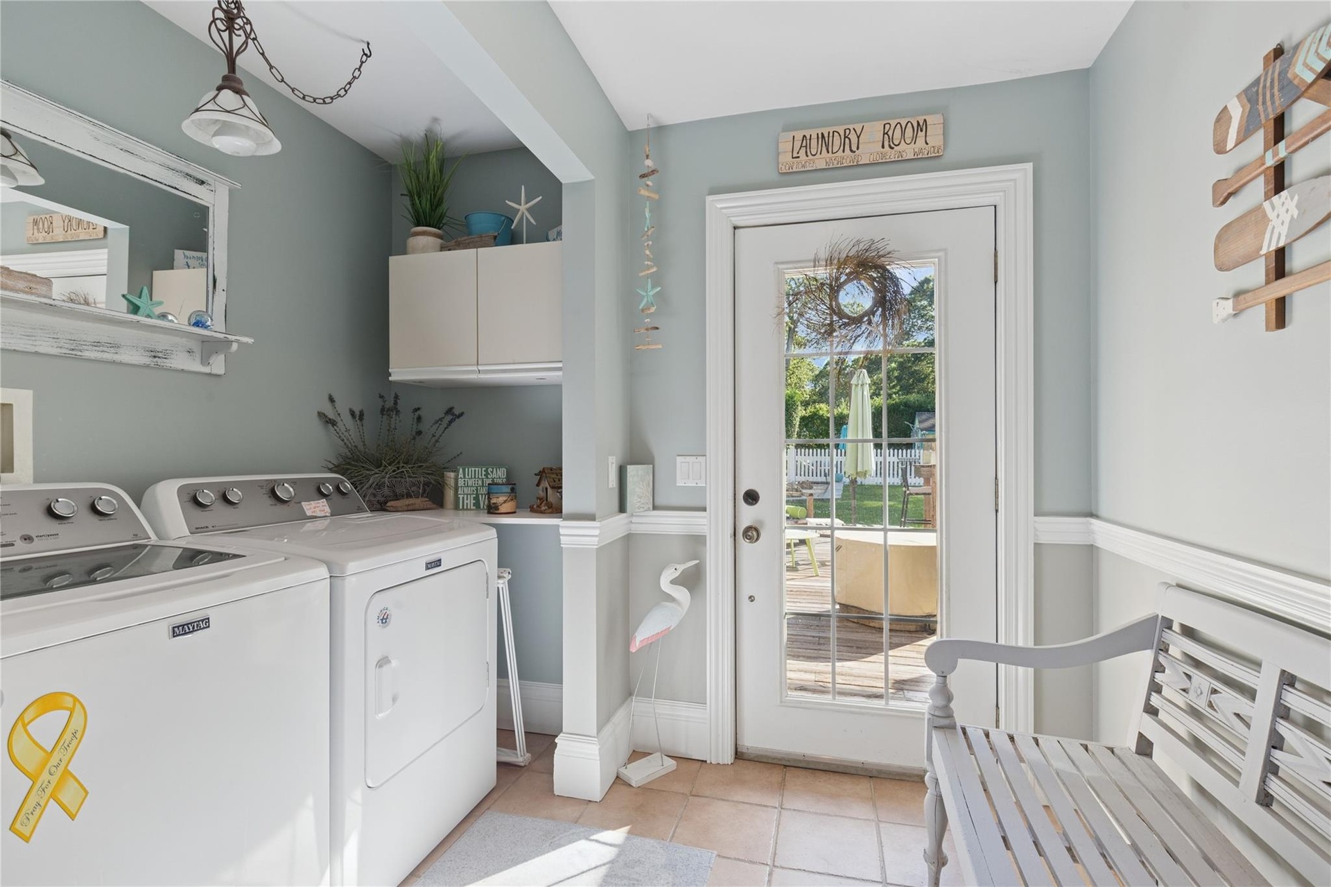 - Laundry area with washing machine and clothes dryer, cabinet space, and light tile patterned flooring