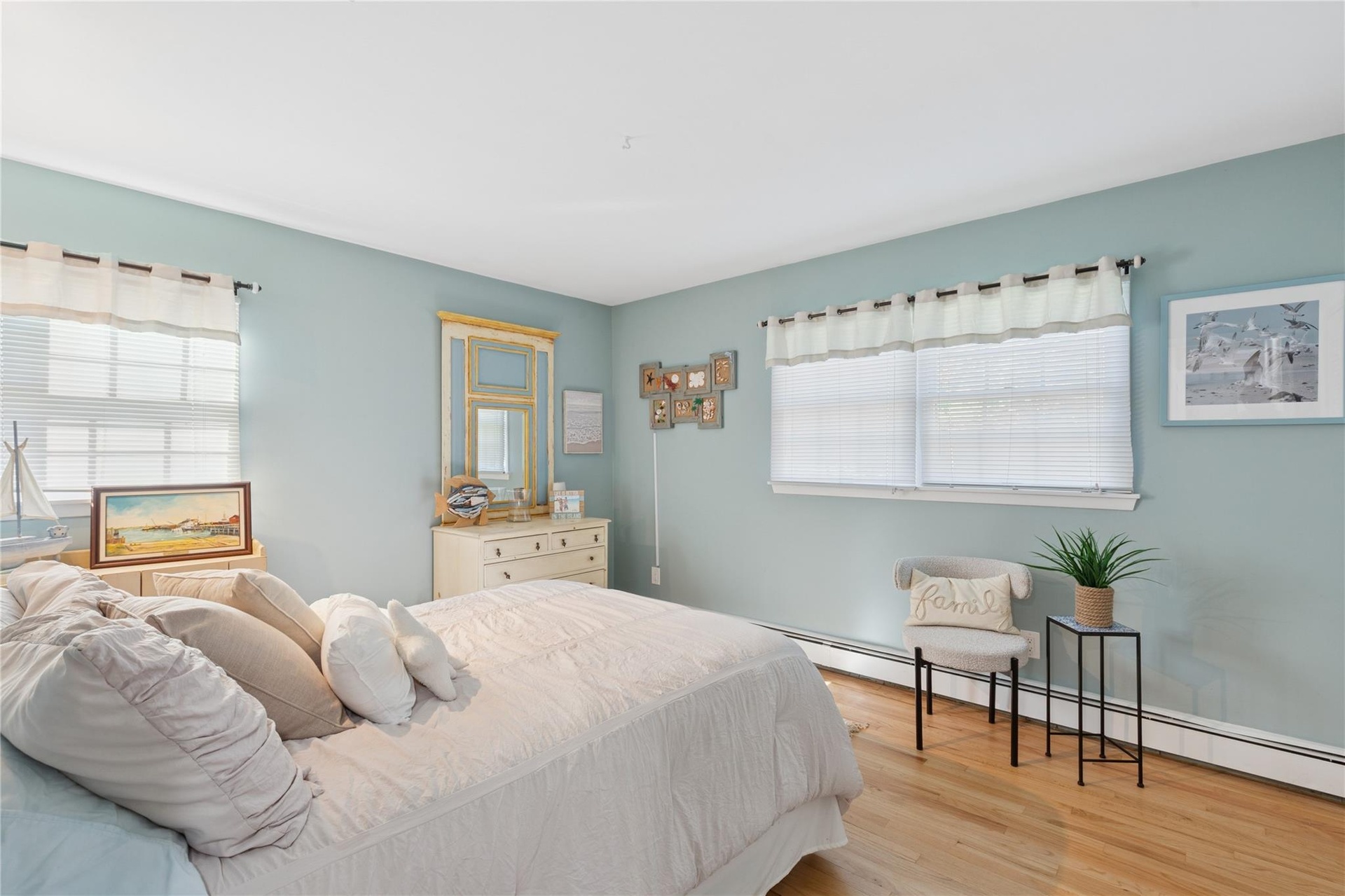 - Bedroom featuring multiple windows, wood finished floors, and baseboard heating
