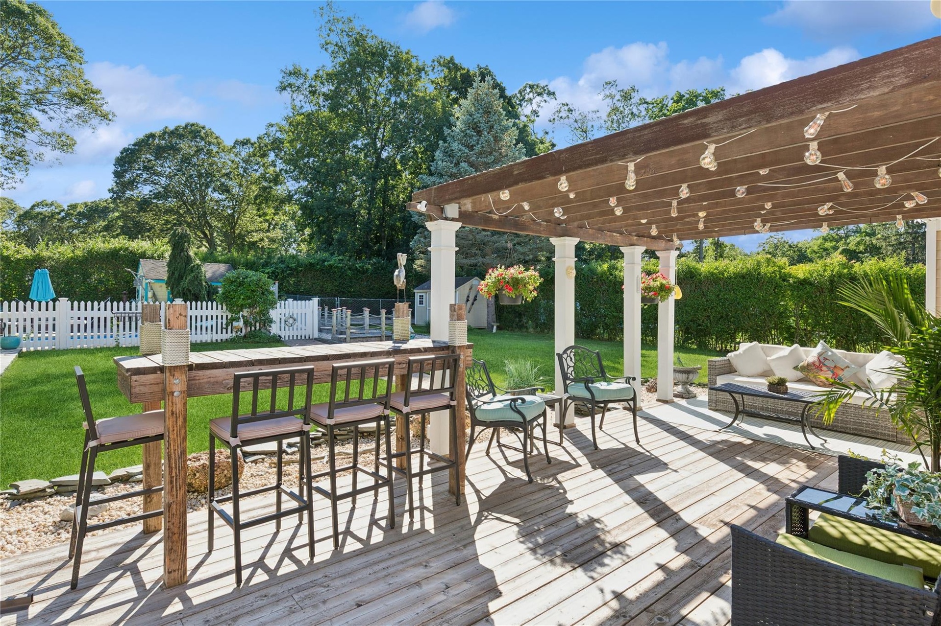 - Wooden terrace featuring an outdoor hangout area, a shed, and a pergola