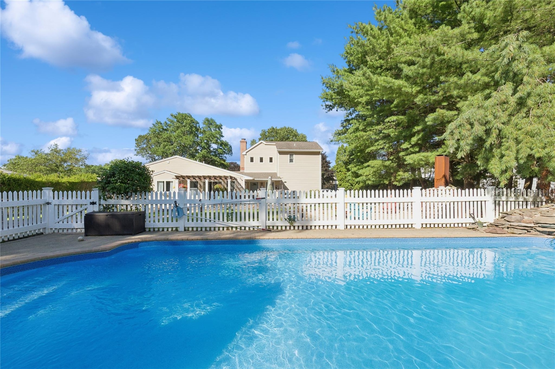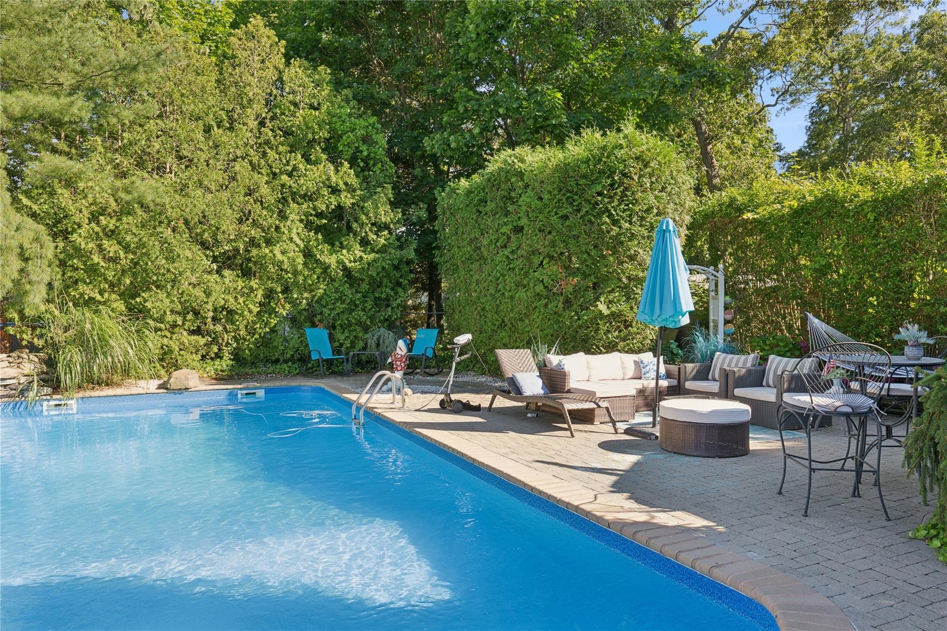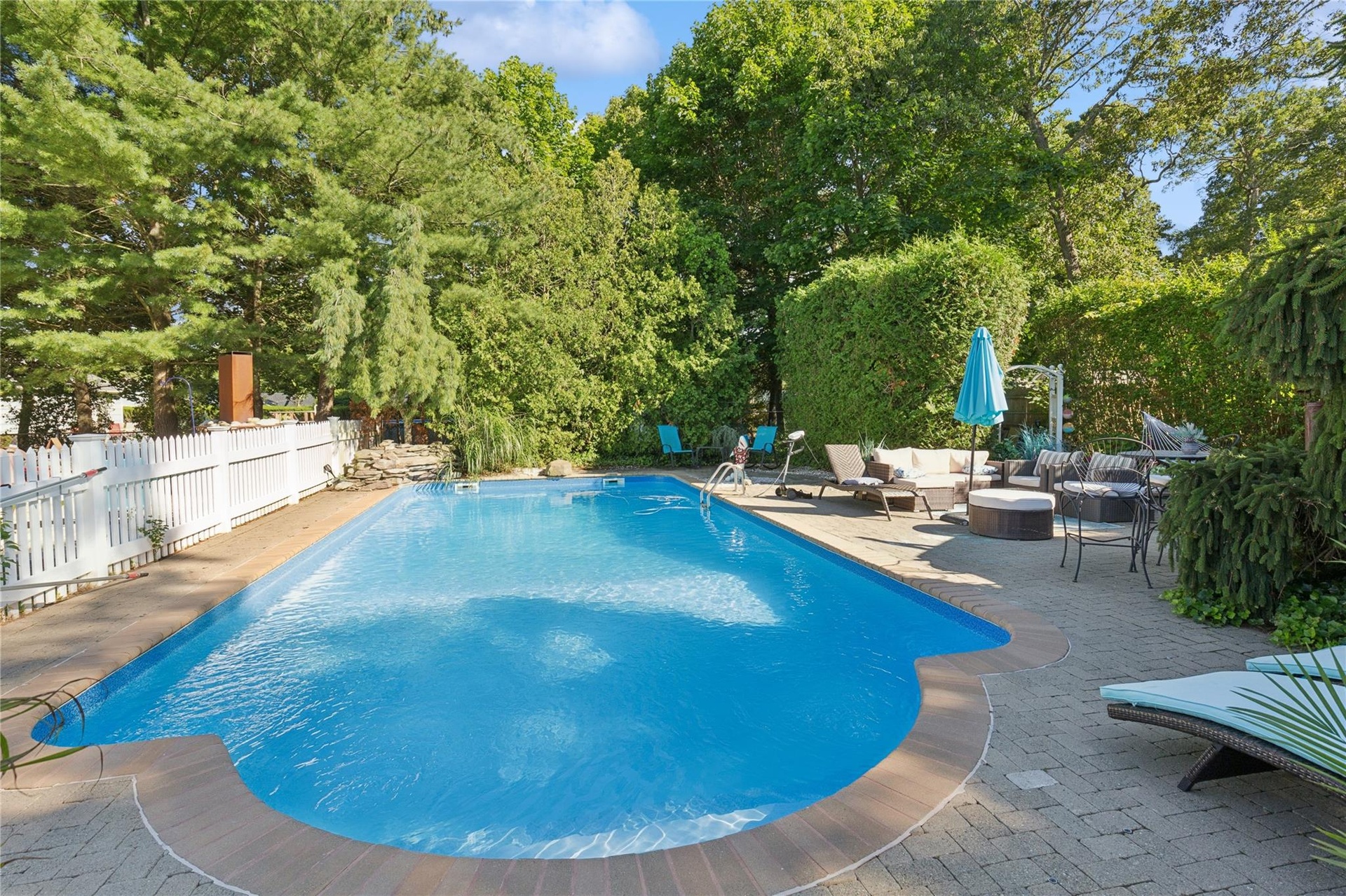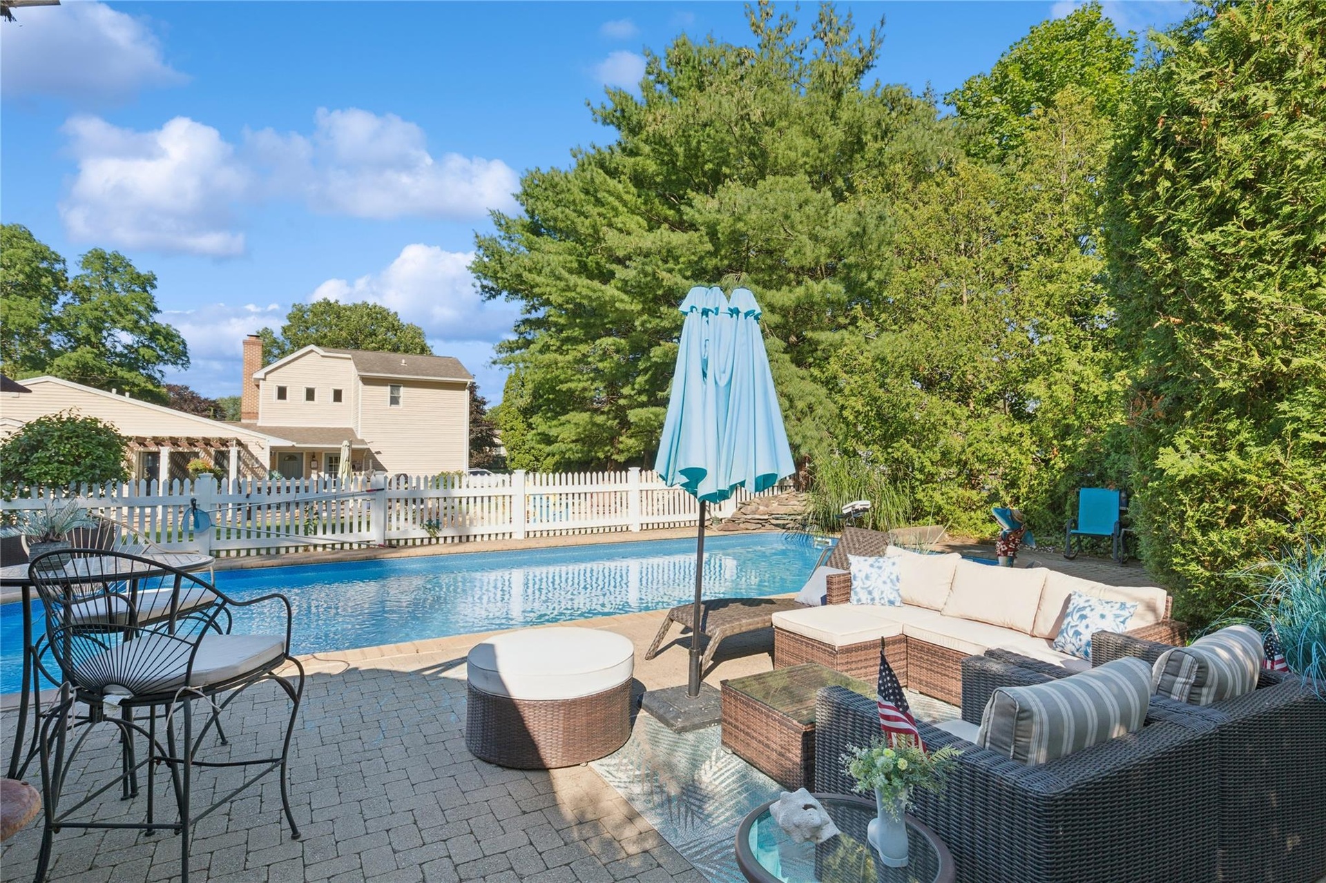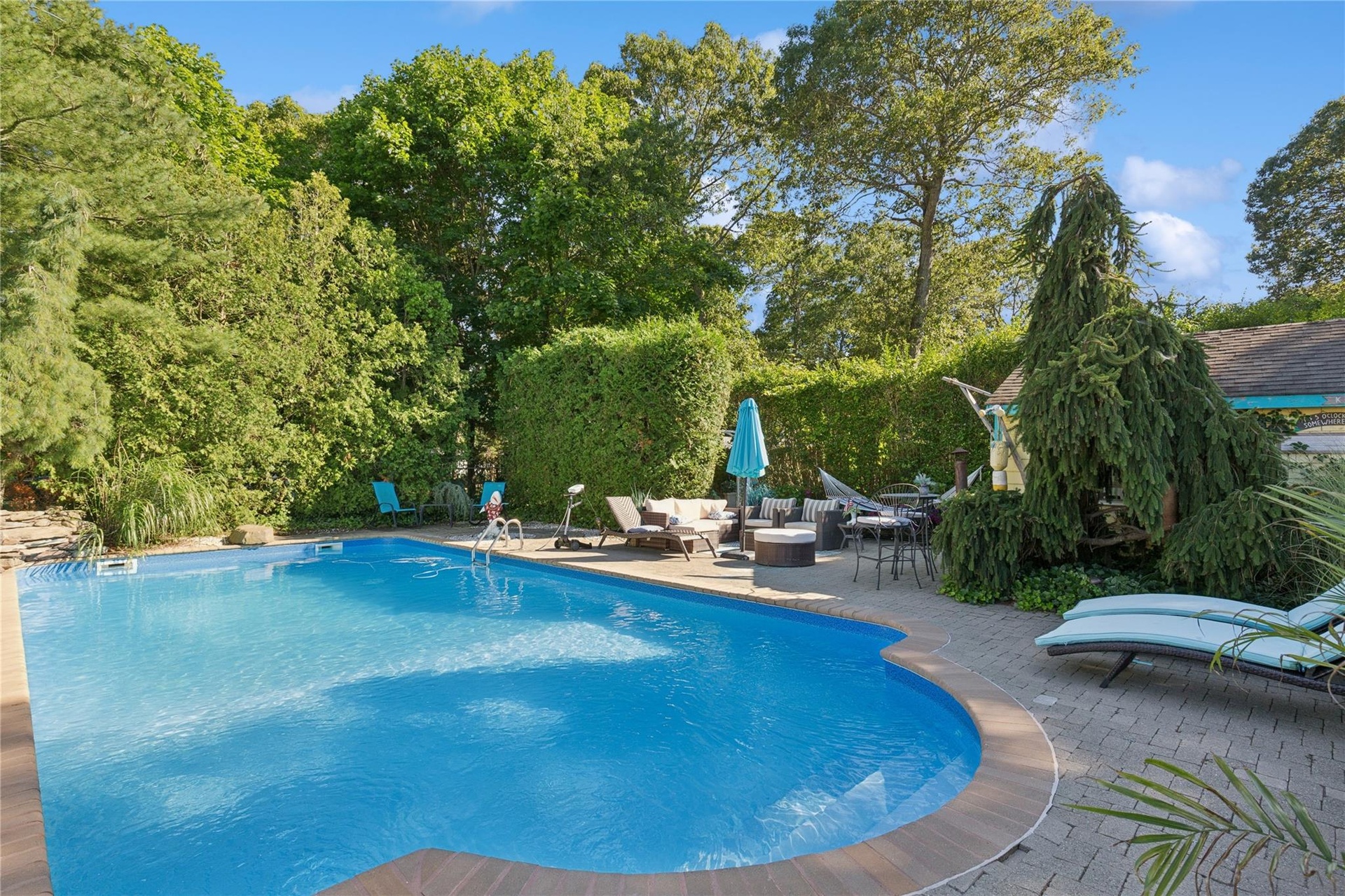 - Swimming pool with a patio area, an outdoor living space, and view of wooded area