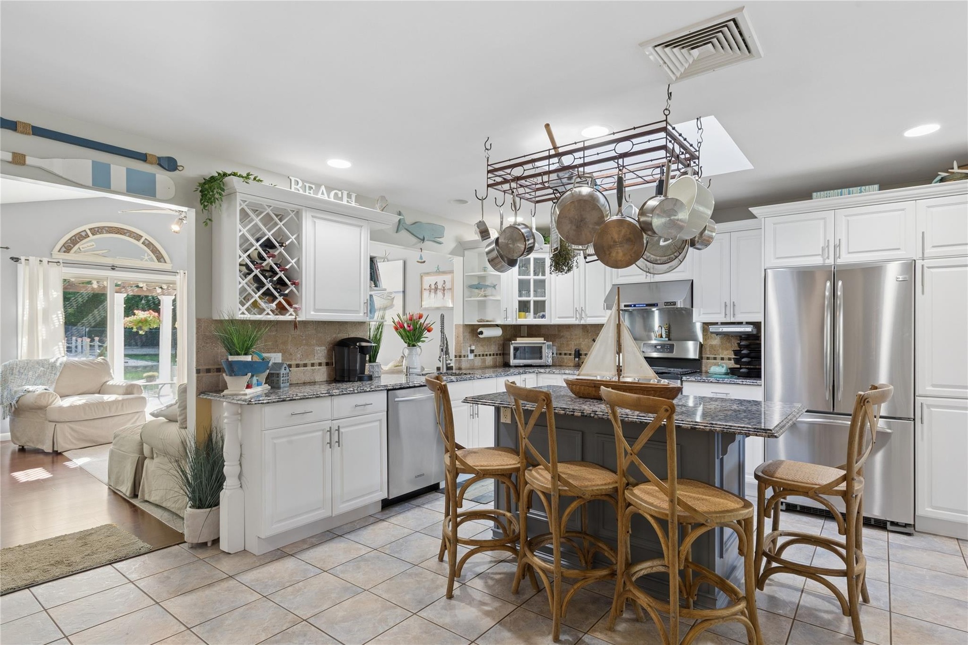 - Kitchen featuring stainless steel appliances, light tile patterned flooring, recessed lighting, tasteful backsplash, and white cabinetry