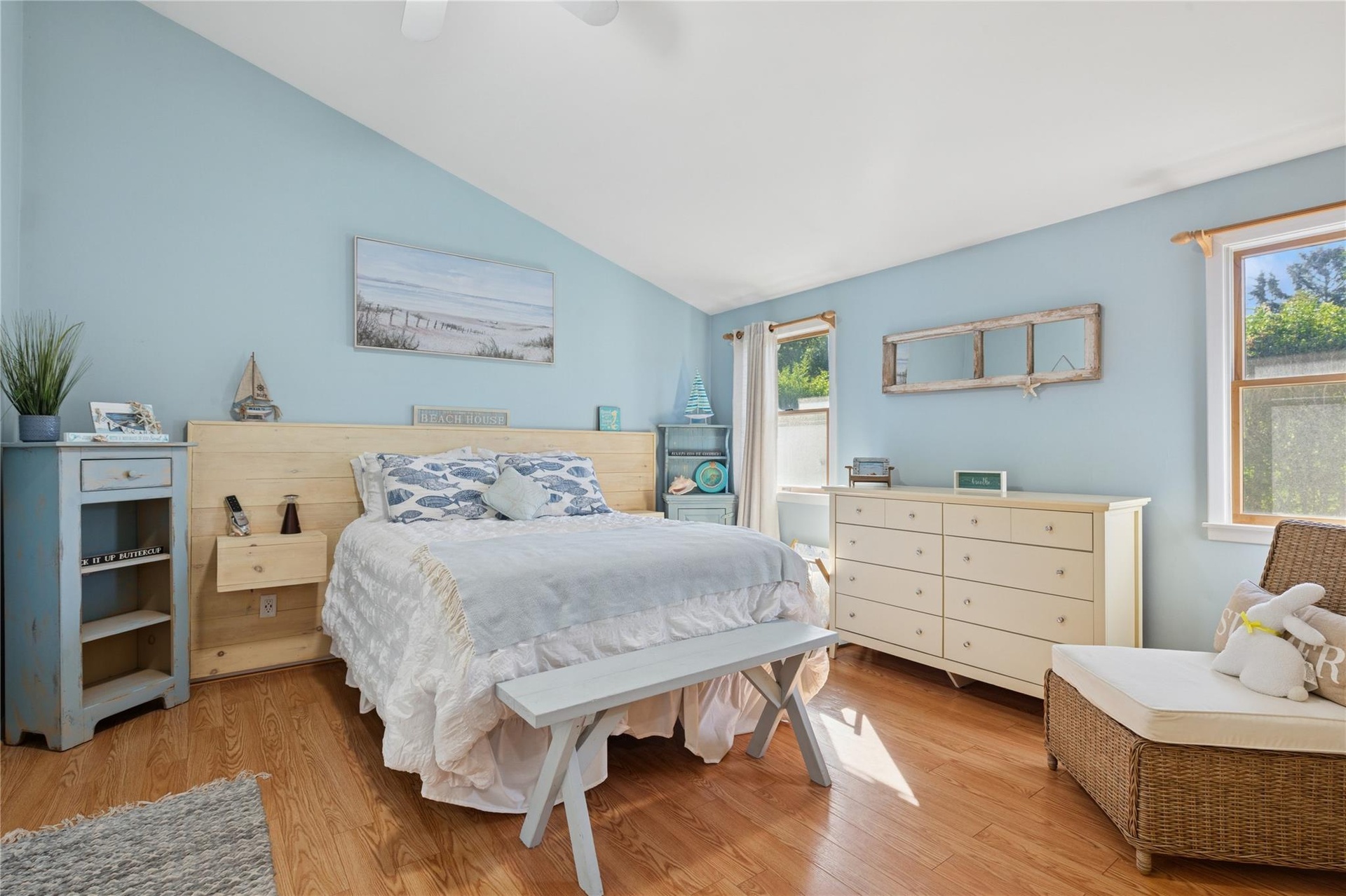 - Bedroom with lofted ceiling, multiple windows, wood finished floors, and a ceiling fan