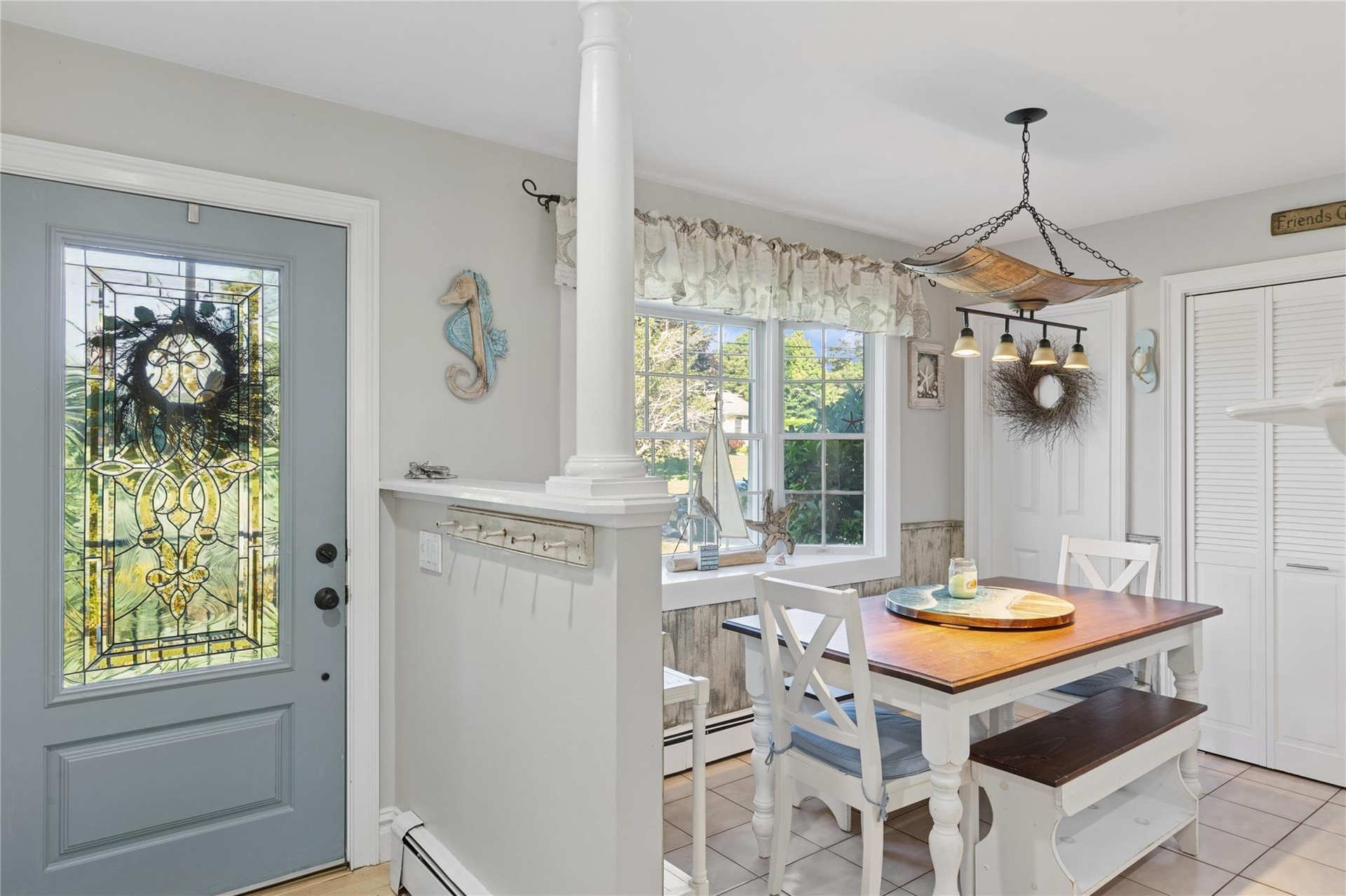 - Dining area with ornate columns, a baseboard heating unit, and light tile patterned floors