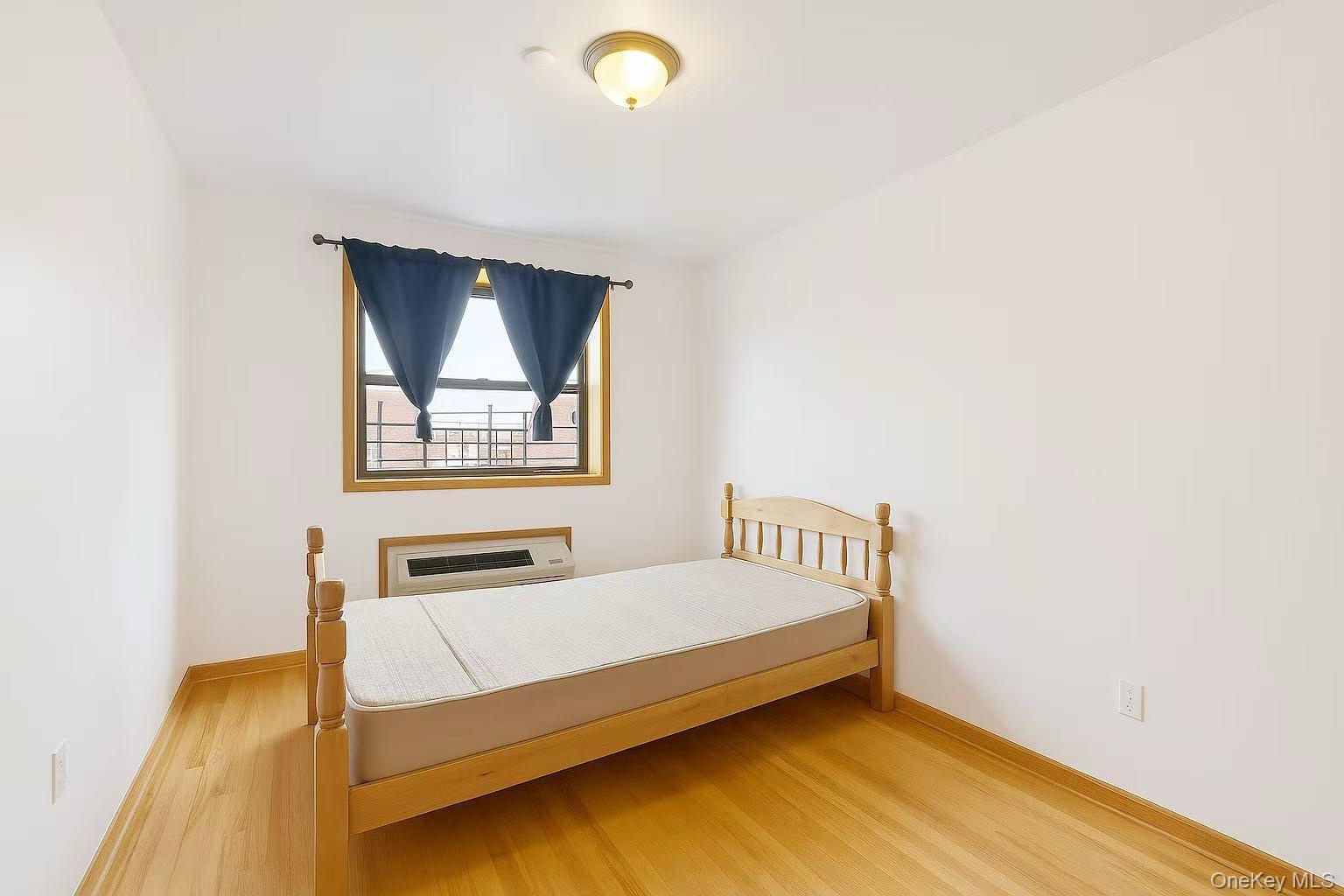 - Bedroom featuring light wood-style floors and radiator heating unit