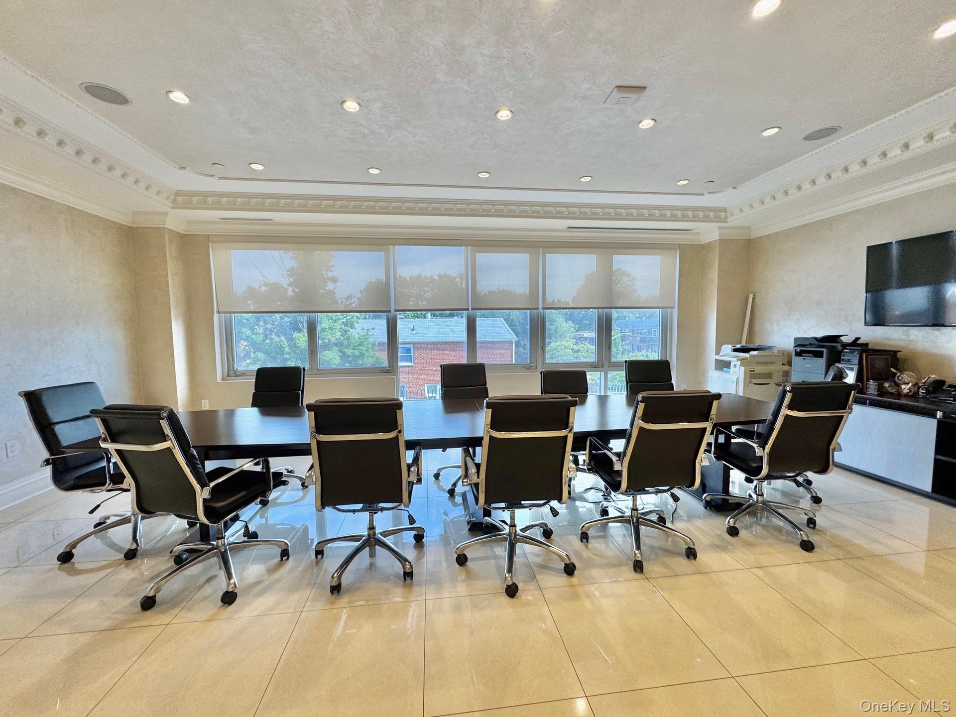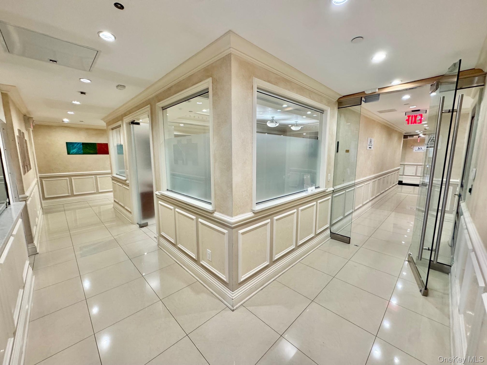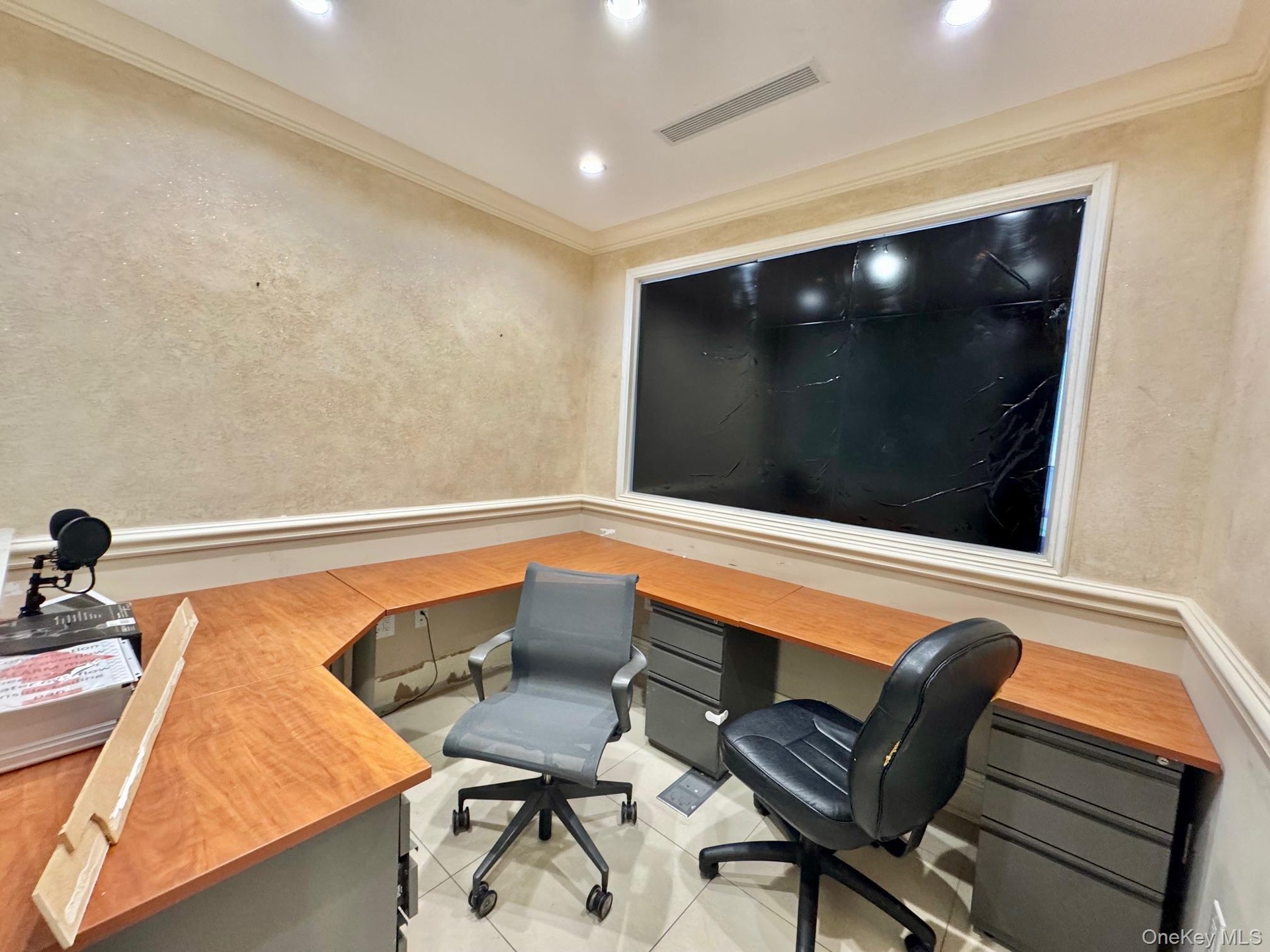 - Office space with recessed lighting, ornamental molding, and light tile patterned floors