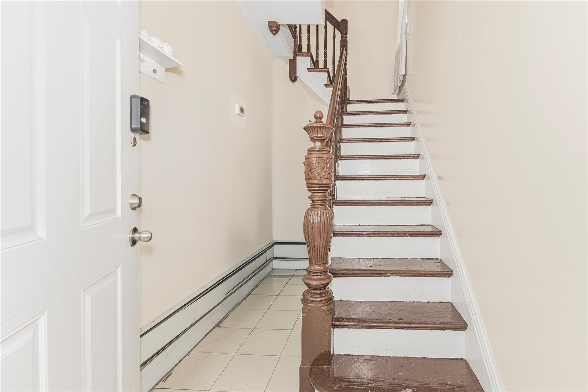 - Stairway with baseboard heating and tile patterned flooring