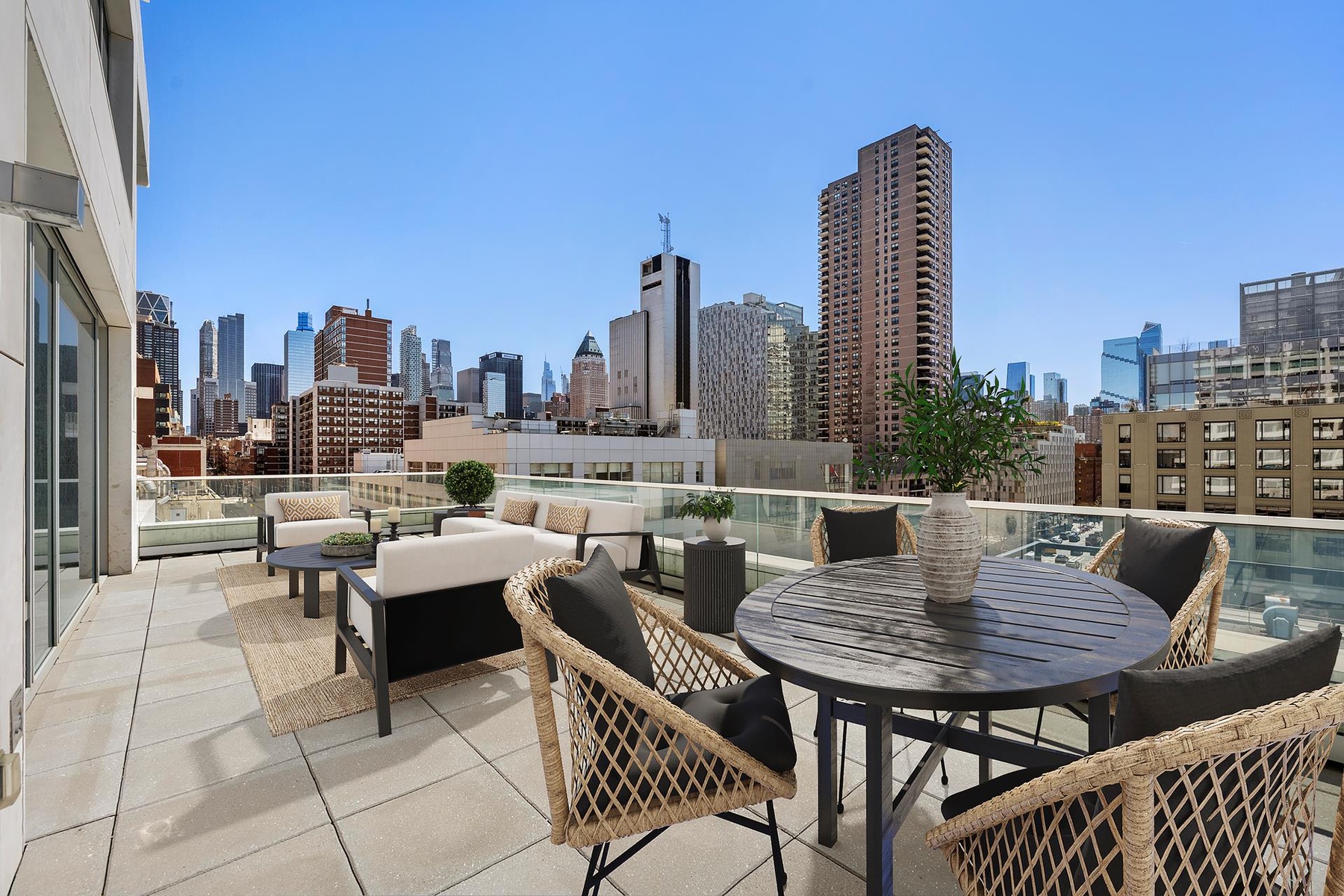 611 West 56th Street's exclusive amenities suite include an outdoor garden mezzanine; a state-of-the-art fitness center with designated yoga and training studio; changing rooms with steam rooms; a media room with billiards table; a playroom; and a large entertaining lounge with separate dining room, kitchen, and discreet catering kitchen. Parking, as well as additional storage units, are also available.