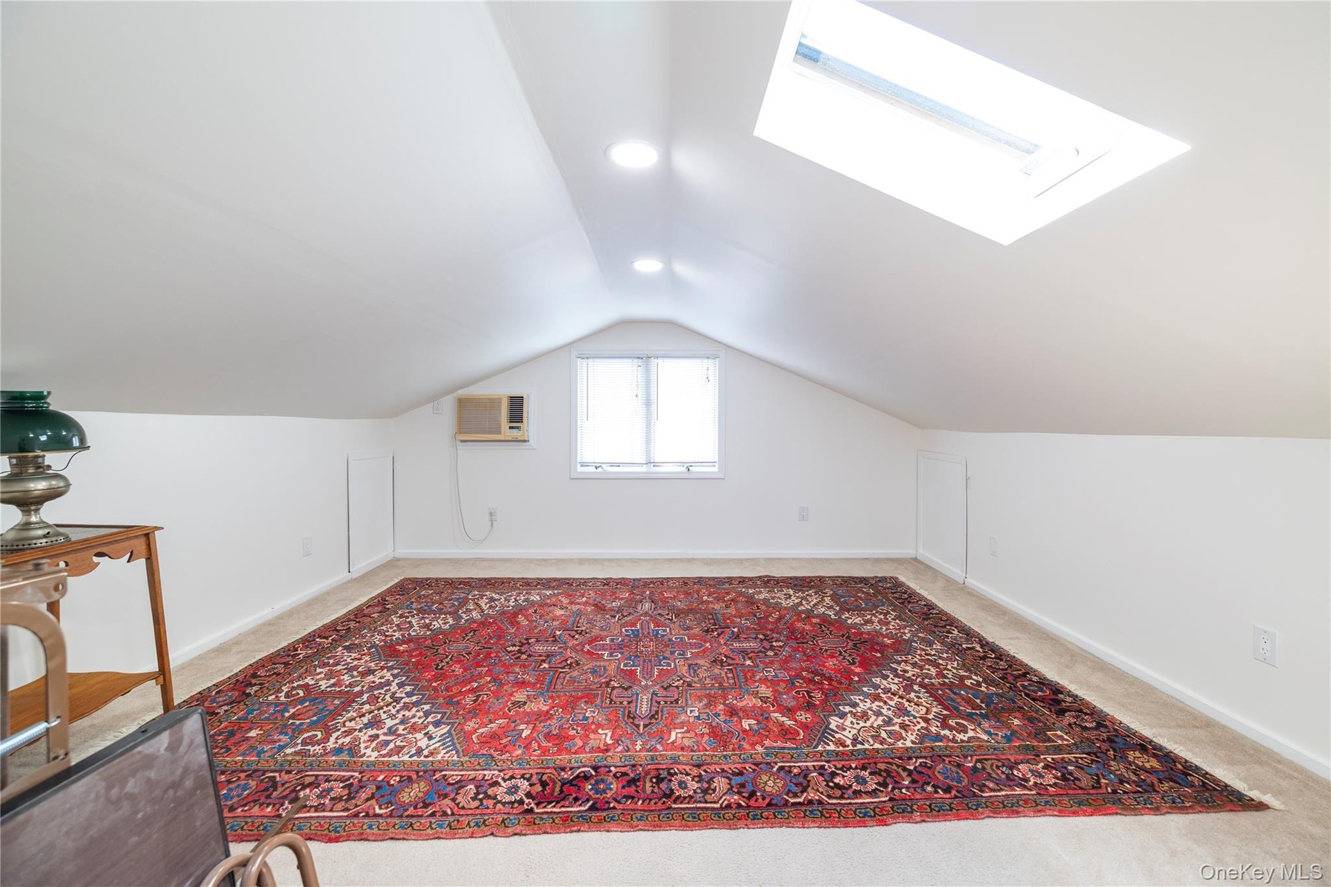 - Additional living space with vaulted ceiling, carpet floors, a skylight, and a wall mounted AC