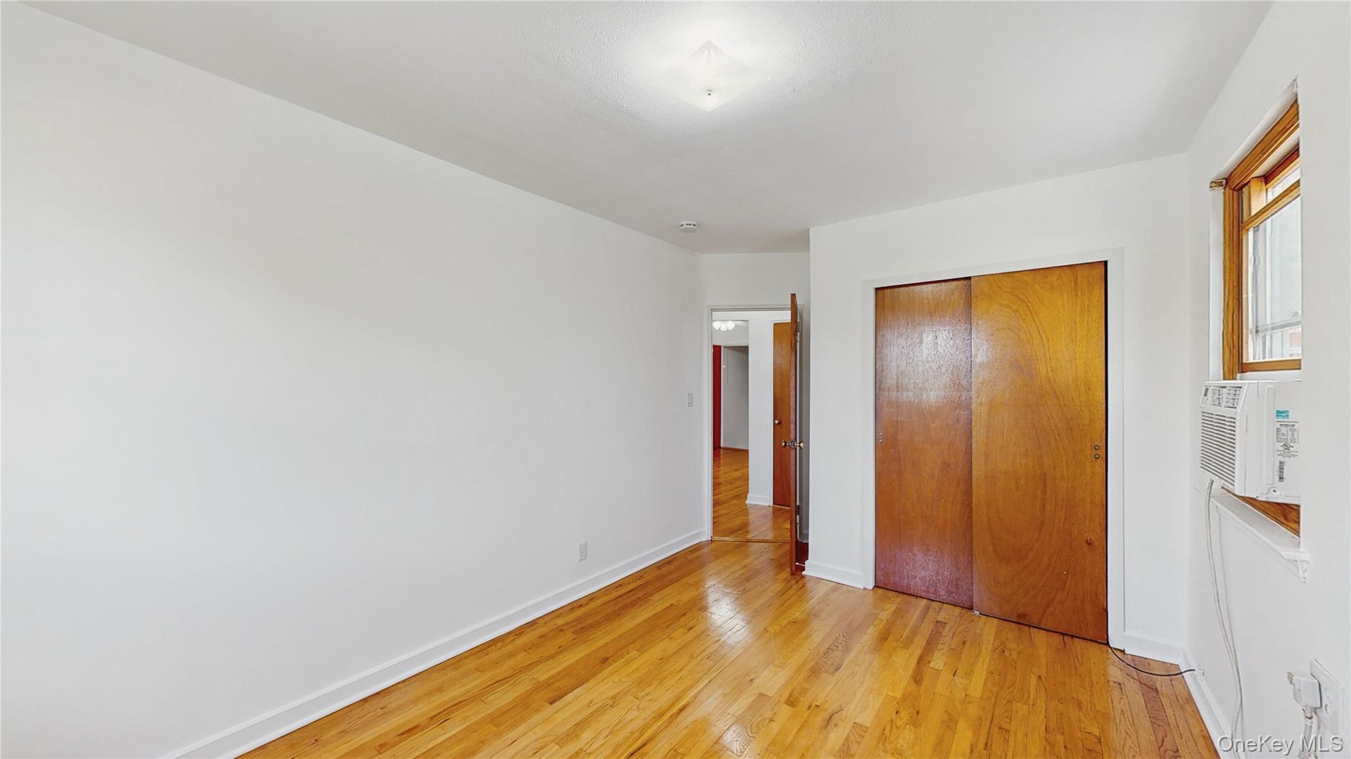 - Empty room featuring light wood-type flooring, radiator heating unit, and an AC wall unit