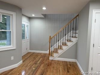 - Entryway featuring wood finished floors, recessed lighting, and stairs