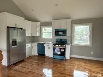 - Kitchen with appliances with stainless steel finishes, wood finished floors, white cabinets, and lofted ceiling