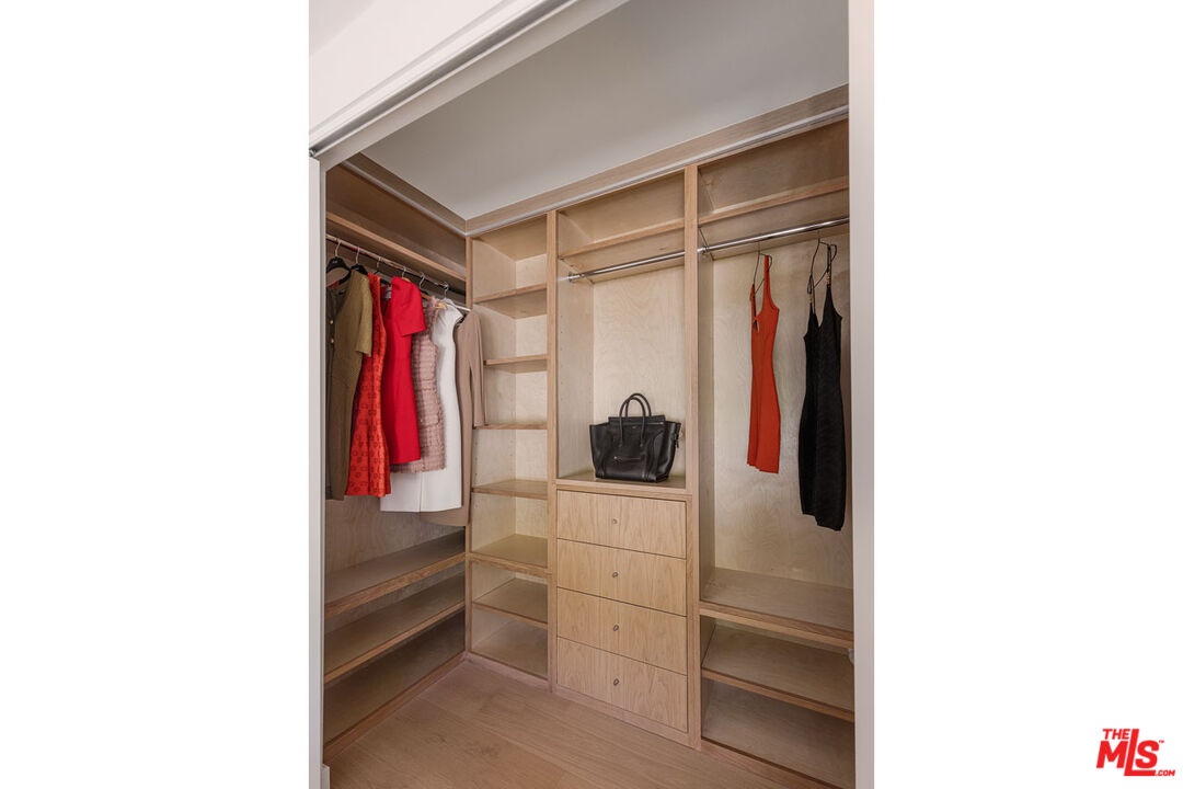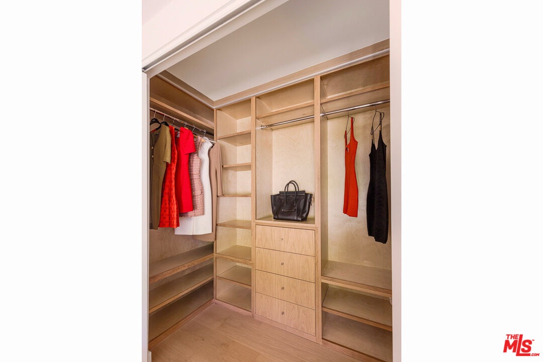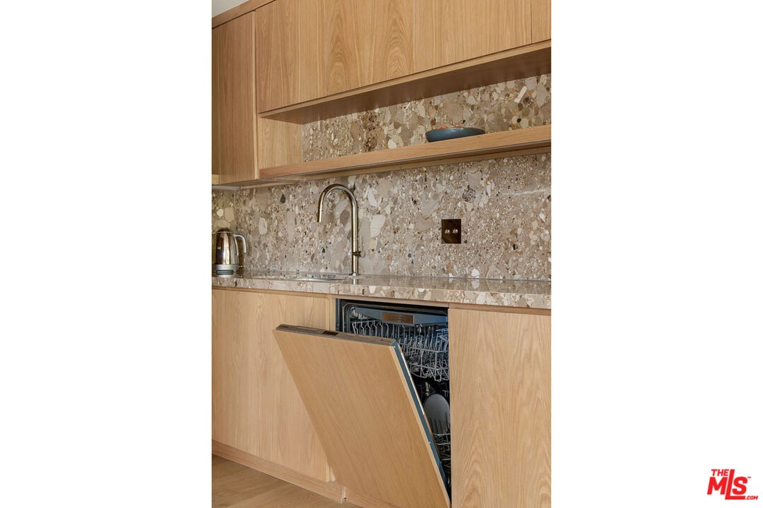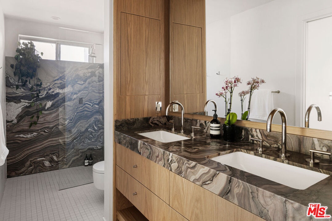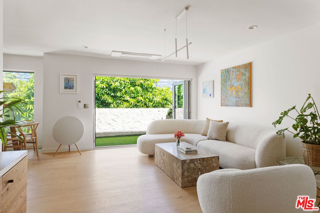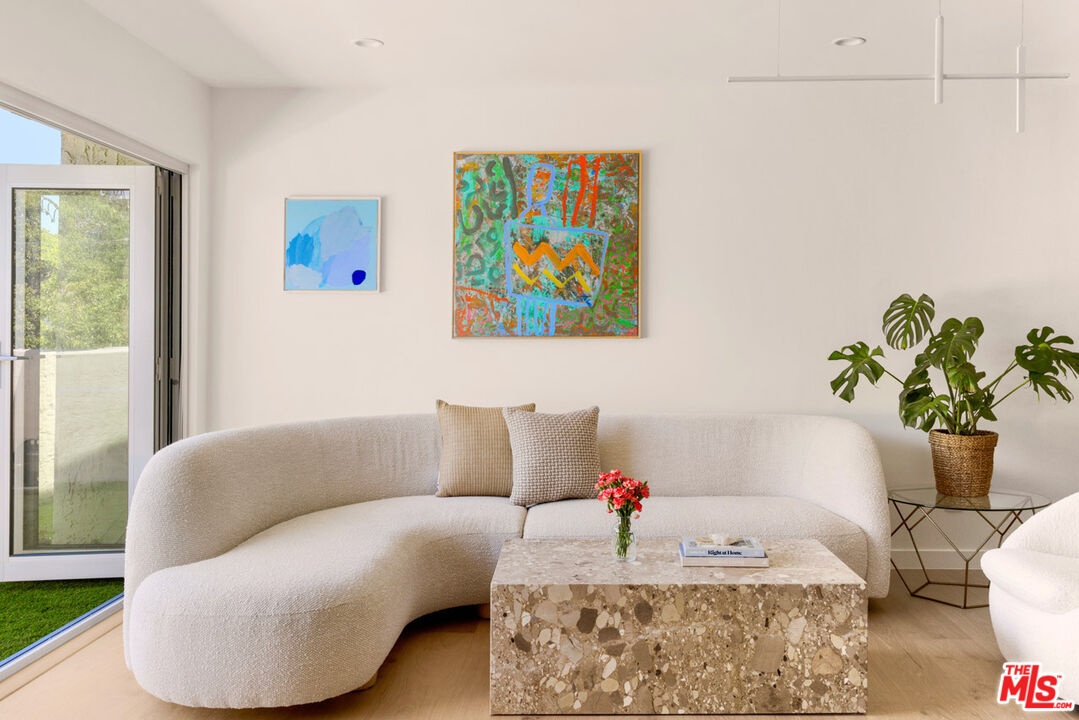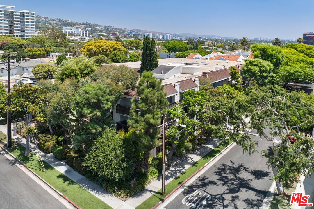 In West Hollywood's coveted Norma Triangle, this top-floor corner residence is a luxurious urban retreat, a sanctuary you've been seeking, with exquisite finishes and verdant views. Set within a gated courtyard building, the light-filled home presents a spacious great room with seamless indoor-outdoor flow; a folding glass wall expands the living space to a wraparound balcony overlooking treetop vistas and city lights. Italian white oak flooring and cabinetry, Italian marble countertops, and Forbes & Lomax switchware are just some of the refined details. The kitchen is outfitted with Fisher & Paykel appliances and a Bosch dishwasher, plus a built-in desk with matching oak surface. The bedroom enjoys balcony access and a custom white oak walk-in closet; the spa-like bath is finished in marble with double sinks, oak cabinetry, and a soft-lit mirror framing your best looks. With no shared walls,updated windows, and discreet mini-splits, this sophisticated haven puts you just moments from Melrose boutiques, Soho House, the Troubadour, and all the energy of Sunset Boulevard. Convenient parking options include a dedicated garage space plus street parking permits for your guests.